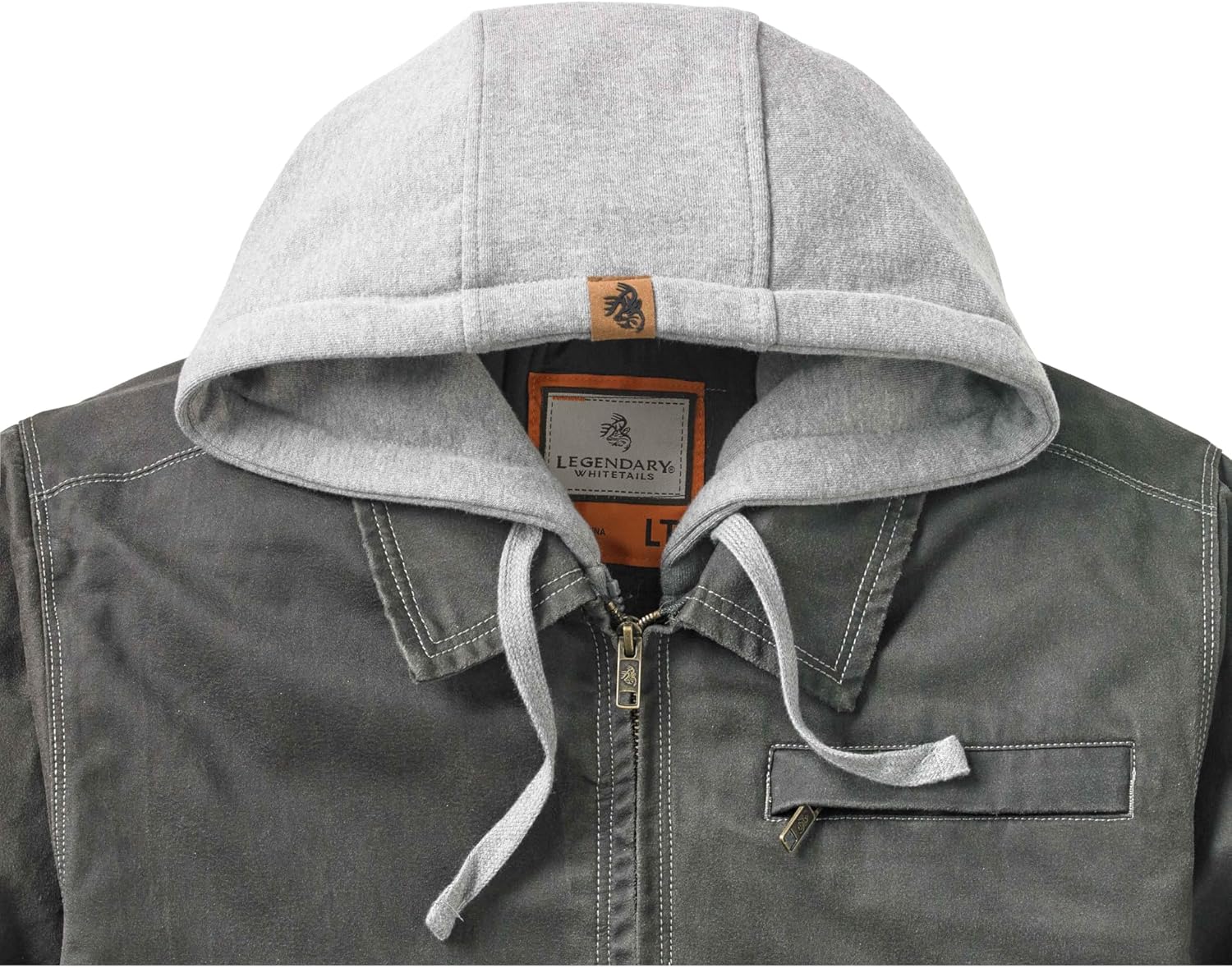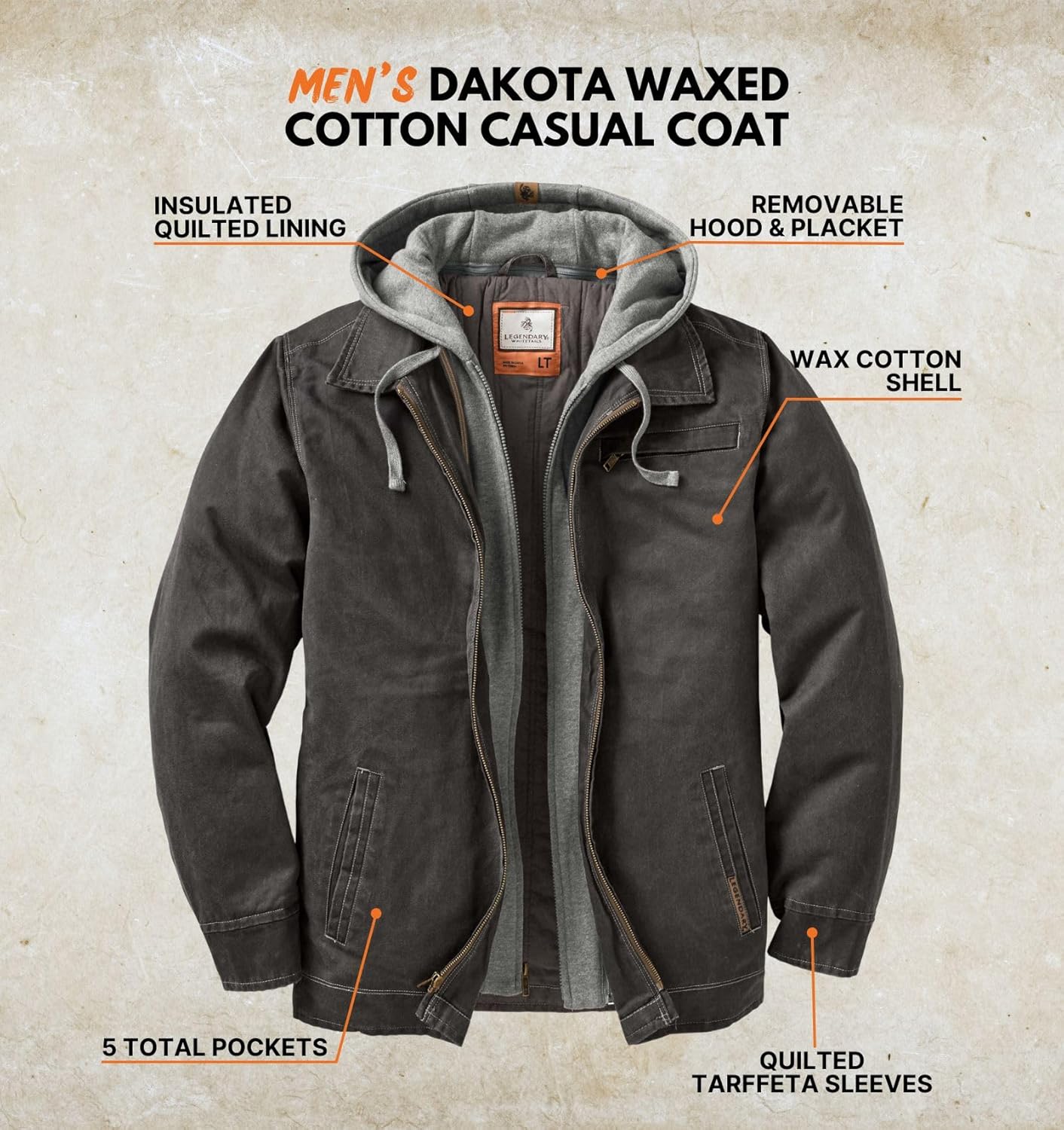 FEATURES: A rugged waxed cotton shell, insulated quilted cotton lining and taffeta-lined sleeves, full zip front, snap cuffs, and a removable hood