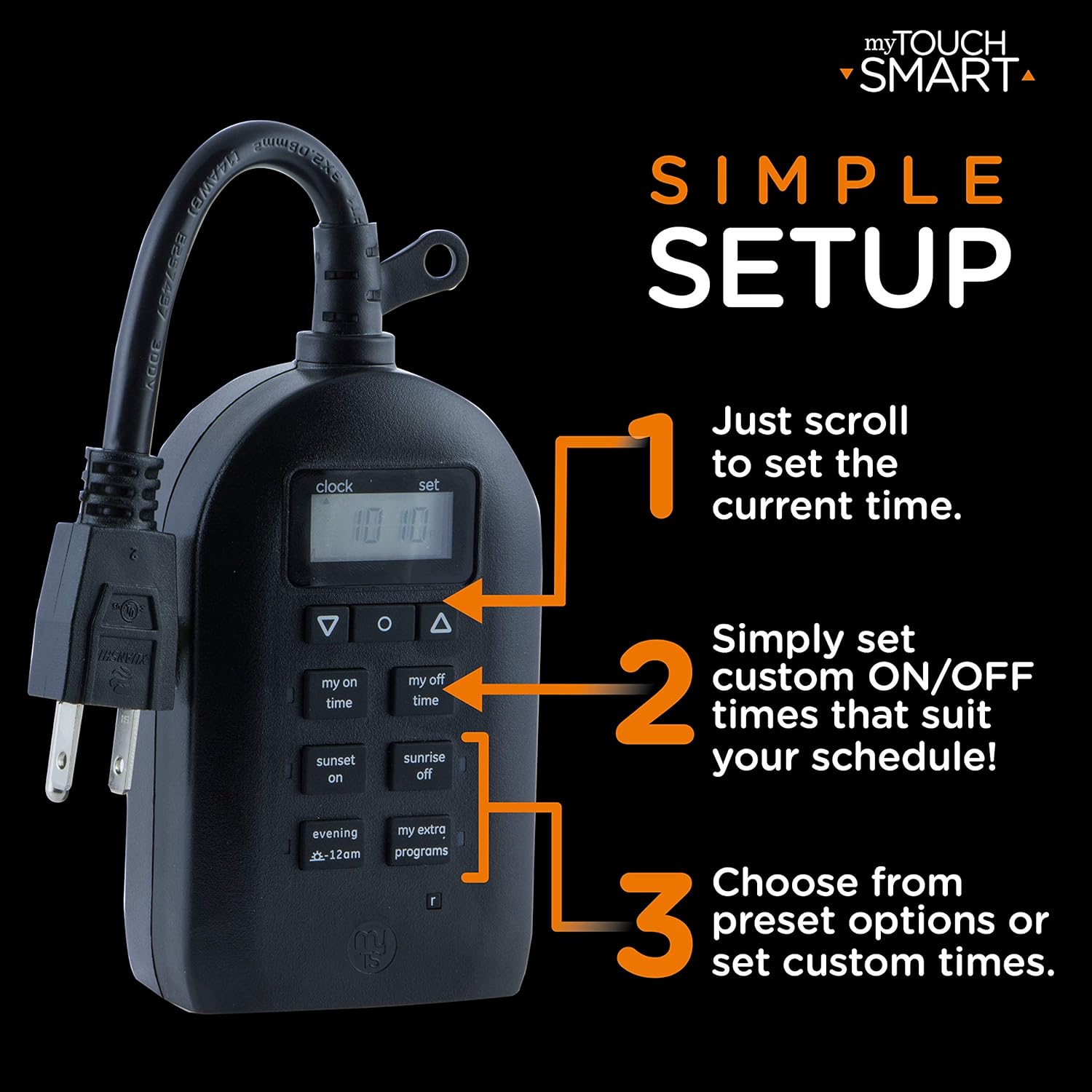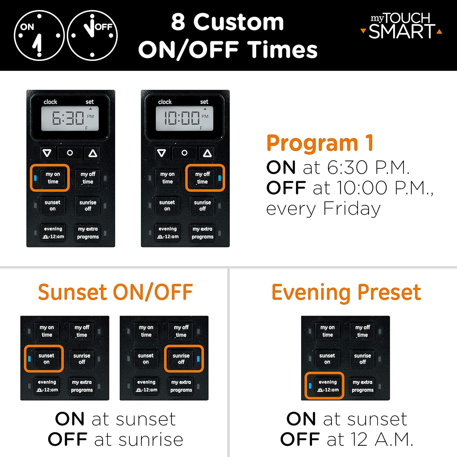 Choose from preset options, set custom on/off times, or set a custom countdown (1 min. to 24 hours). Built-in SunSmart technology allows you to set on/off times that automatically adjust to sunrise/sunset times in your region.