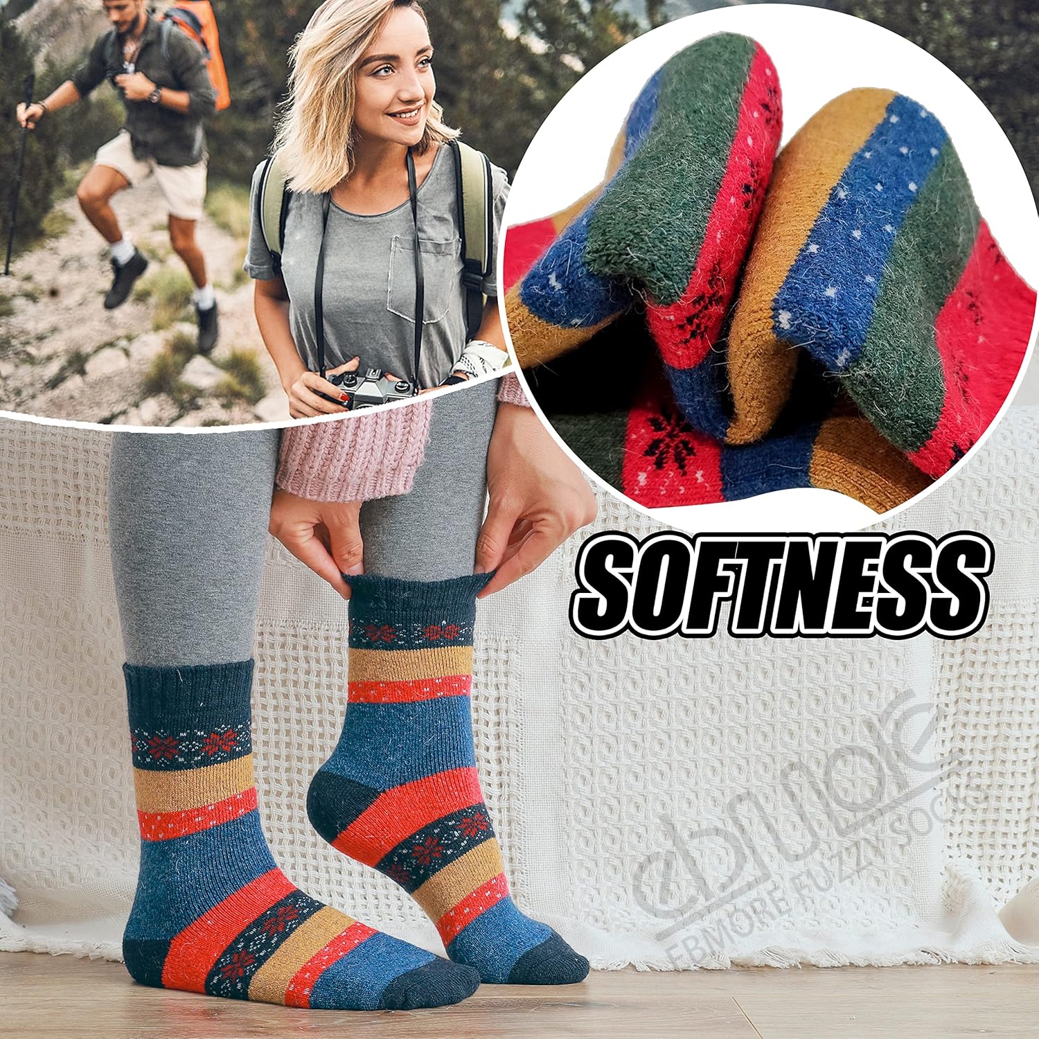 HIGH QUALITY : EBMORE fashion women wool socks are blend of 55% Wool, 25% Cotton, 15% Polyester, 5% Spandex. It’s a premium High Quality merino wool socks, so the socks is very soft, heavy but breathable, cozy, fuzzy inner lining and will keep your feet comfortable and warm.