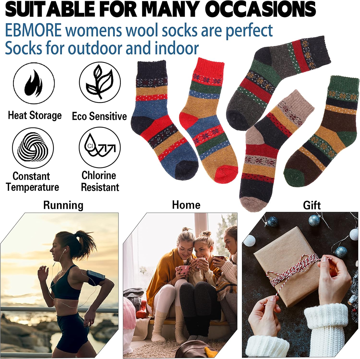 EBMORE Merino Wool Socks for Women Hiking Thermal Warm Winter Thick Boot Cozy Crew Comfy Work Socks for Ladies 5 Pairs