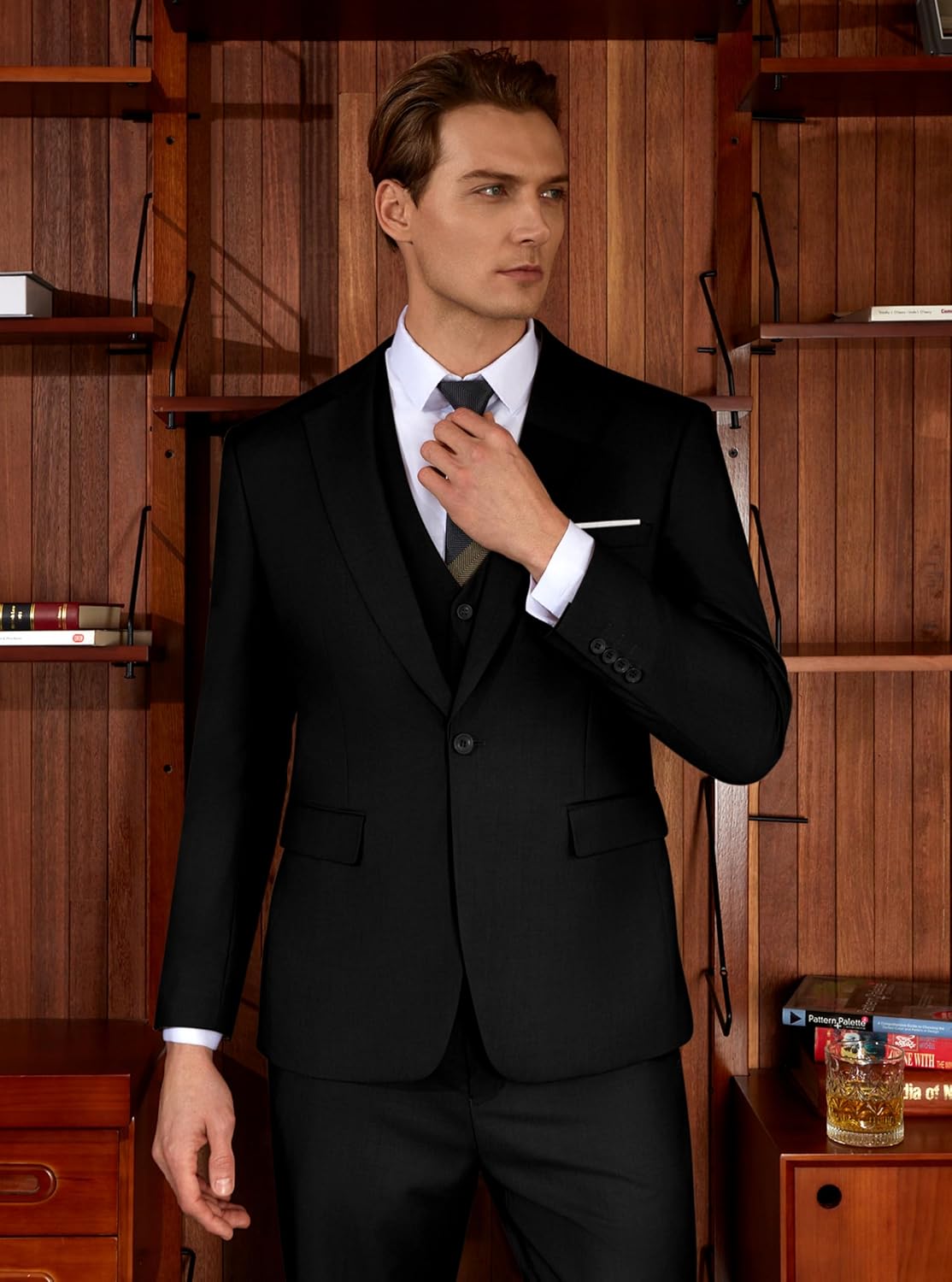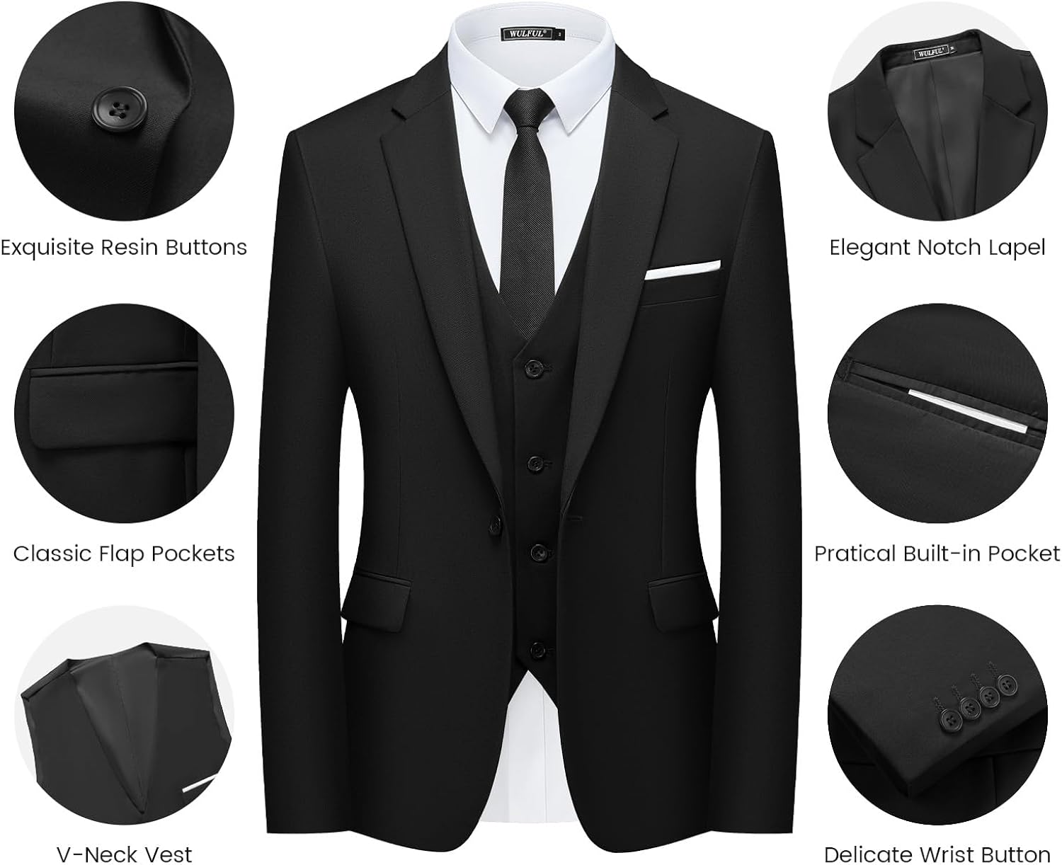 WULFUL Men’s Slim Fit Suit One Button 3-Piece Blazer Dress Business Wedding Party Jacket Vest & Pant