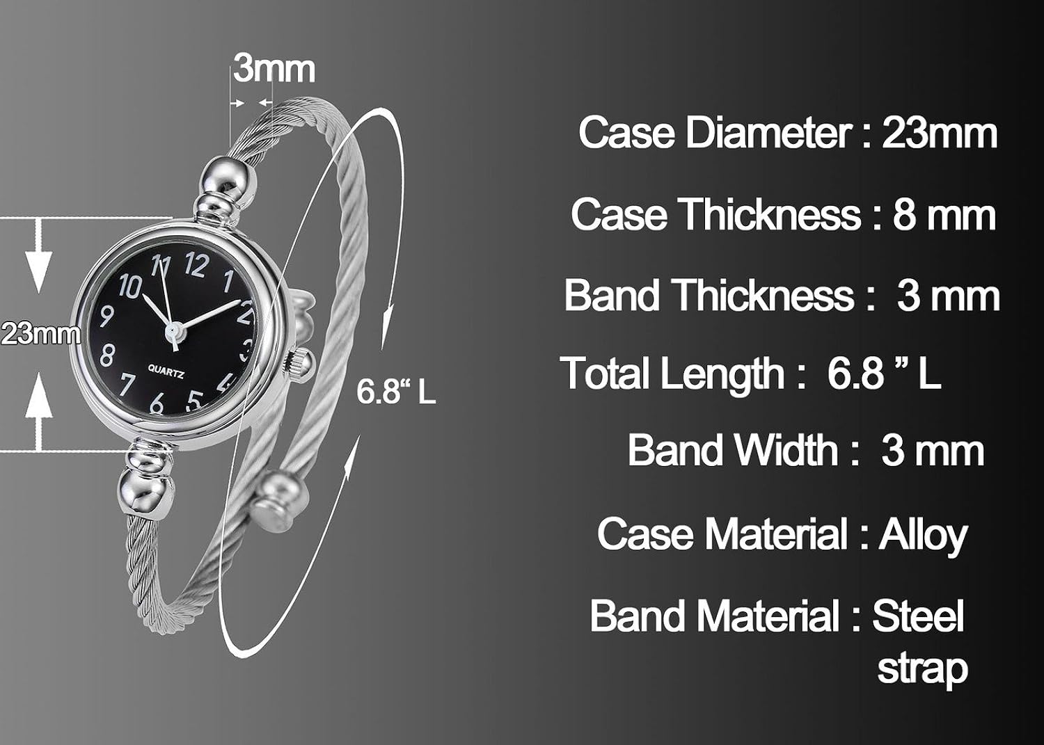 Case Material: Alloy, Strap Material: Stainless Steel; Movement: Quart Analog Movement; Case Size: 23*23*8mm , Strap Width: 0.12 inches(3mm),Watch Length: 6.8 inches(NOTICE: The watch strap is not adjustable, please test your wrist size before purchasing.)
