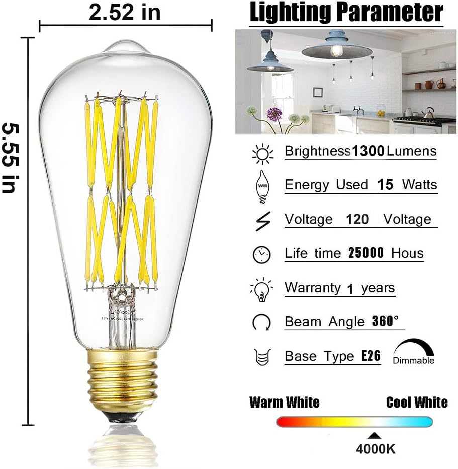TECHNICAL FEATURES:15W Dimmable LED Edison bulb ,Neutral White 4000K,Clear Glass,Base E26, 1300lm, 120V AC input directly.Turn on the light bulb immediately bright, do not need to preheat,No flicker,strobe.