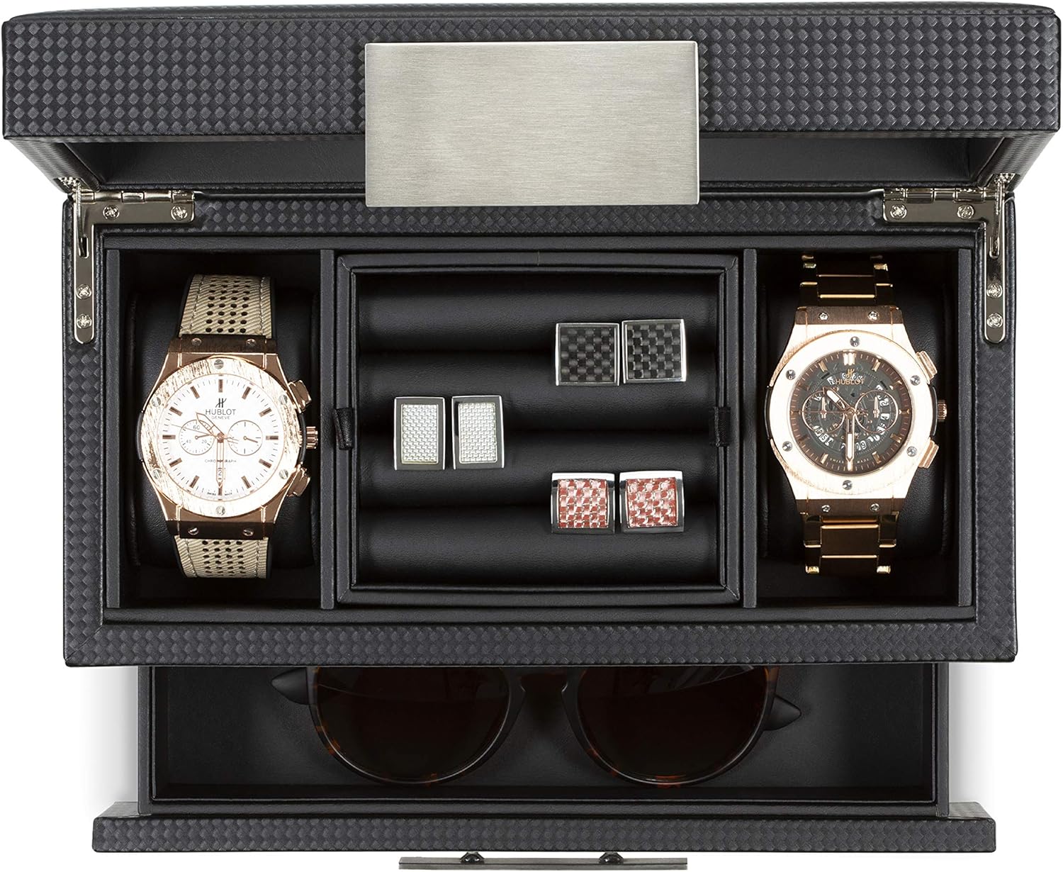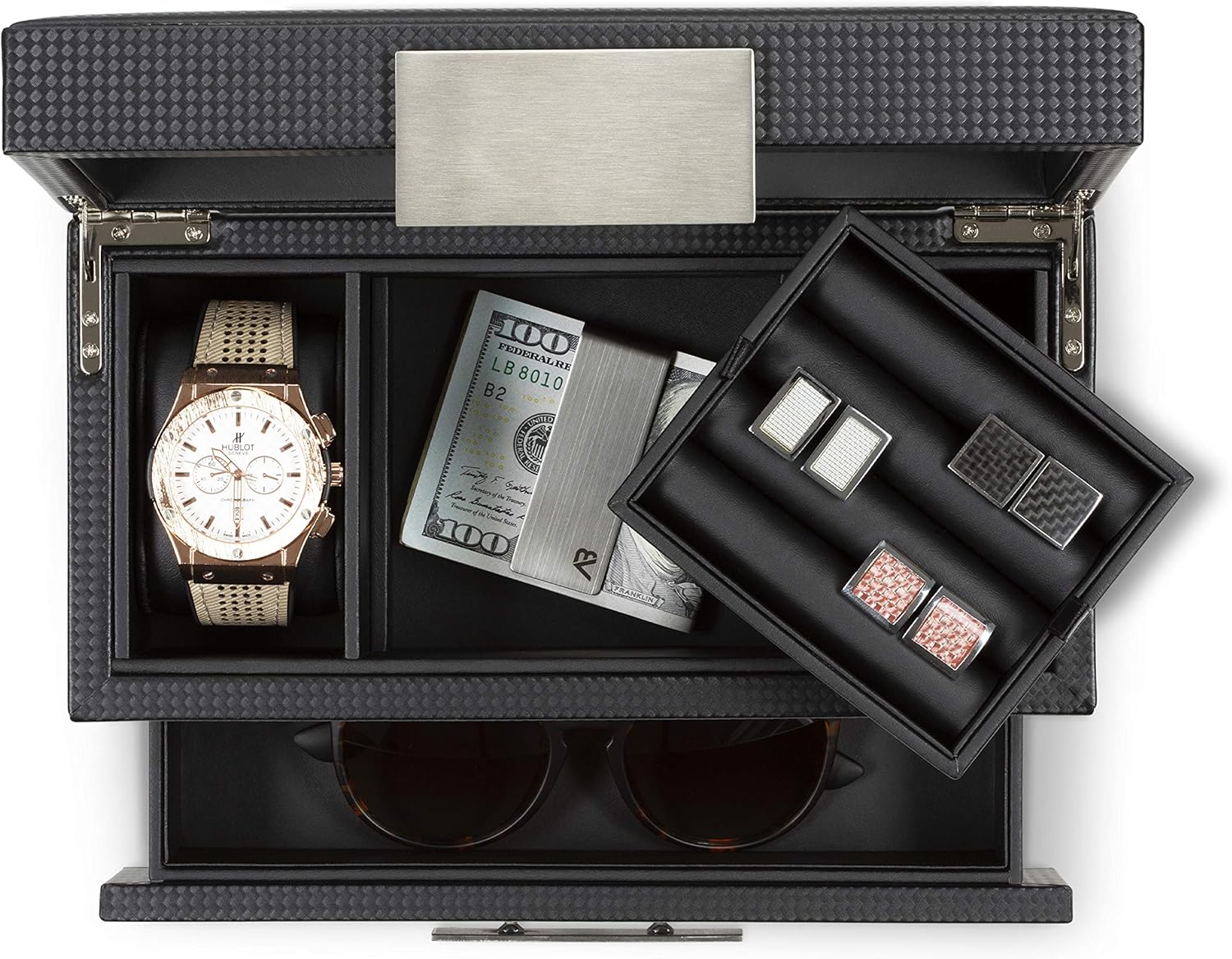 Glenor Co Valet Jewelry Watch Box for Men - Carbon Fiber Texture Organizer with Glass Top, Drawer & Tray - Holder for Watc...