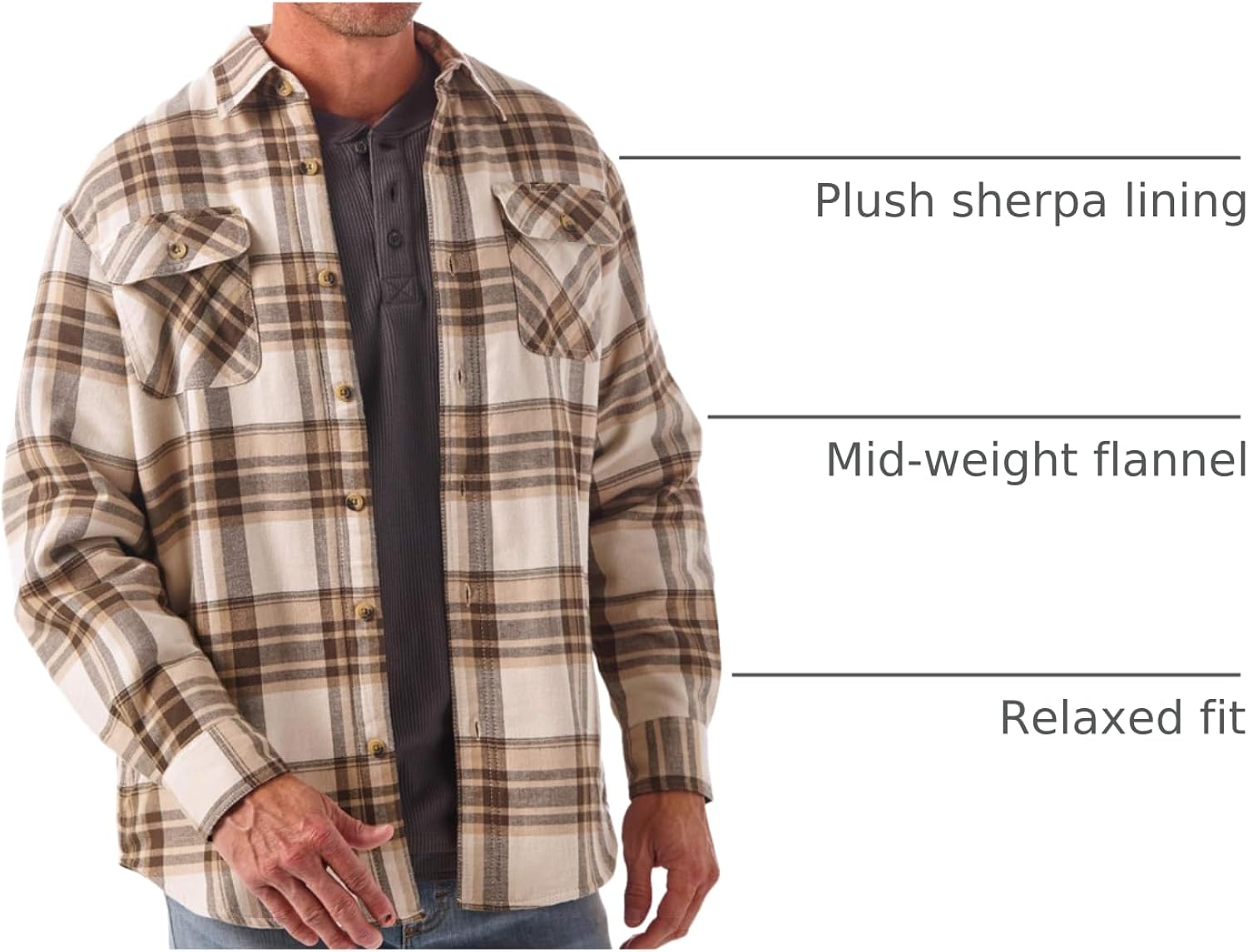 ALL DAY COMFORT. Crafted with a 100% Cotton flannel shell and 100% Polyester soft tan sherpa lining with diamond black quilted padding in the sleeves, this shirt jacket is guaranteed to provide all day comfort.