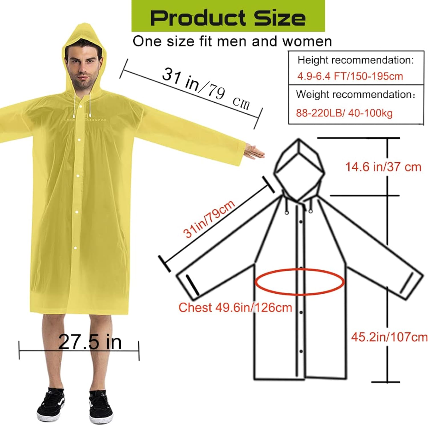 *PERFECT FITS MOST Size:60" by 27.5" with a big drawstring hood, perfect for men, women, youth, and teens, EXTRA Wide (27.5-inch width) fits even with a backpack on,100% WATERPROOF Rain coat will keep you dry and enjoying your outdoor activities.