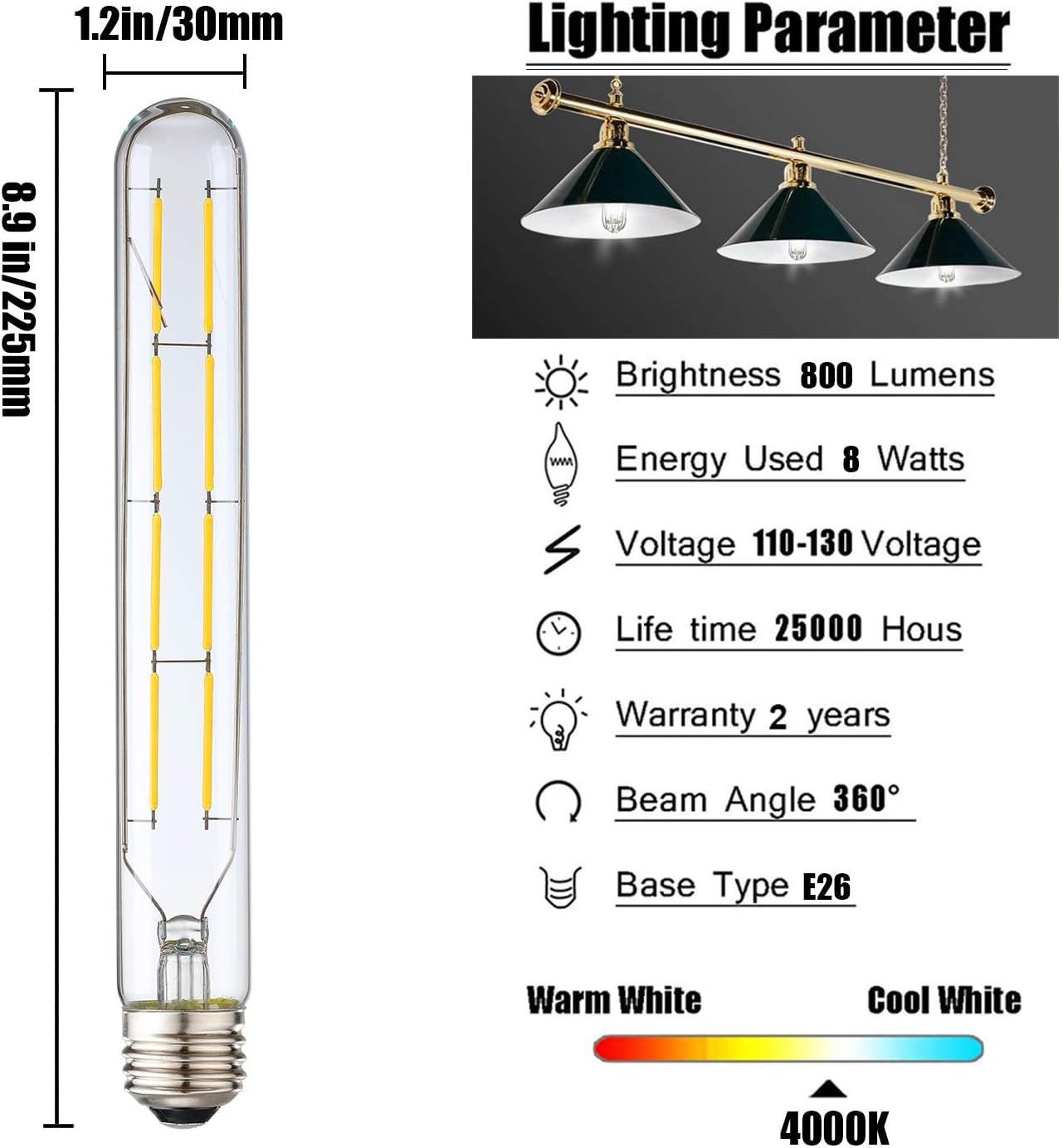 Energy Saving: 8W Long Tubular led bulb replaces the standard 75W incandescent bulb, Daylight 4000K,800LM,120V,Dimmable,E26 medium base,size: 8.9inch*1.2inch.