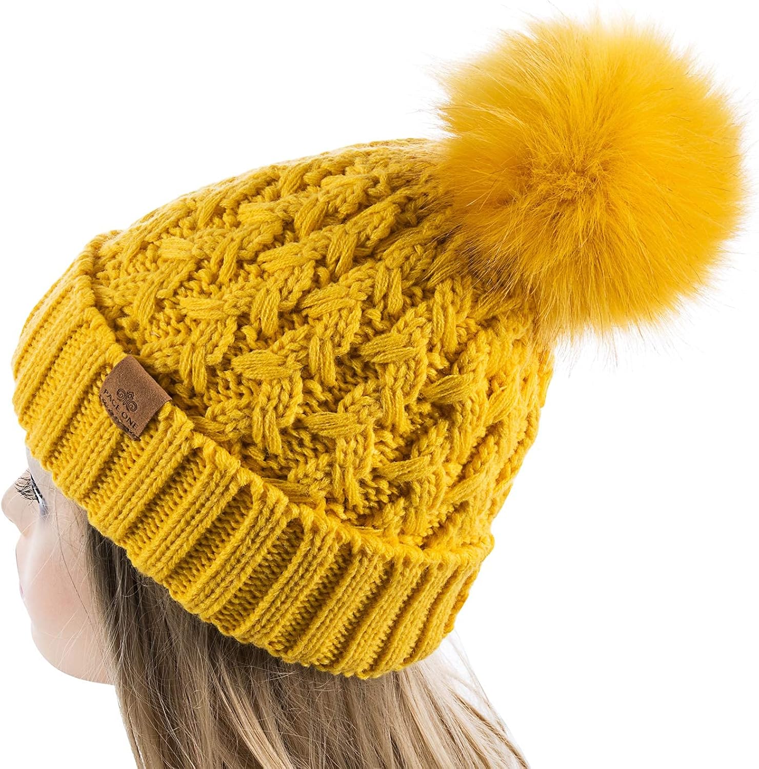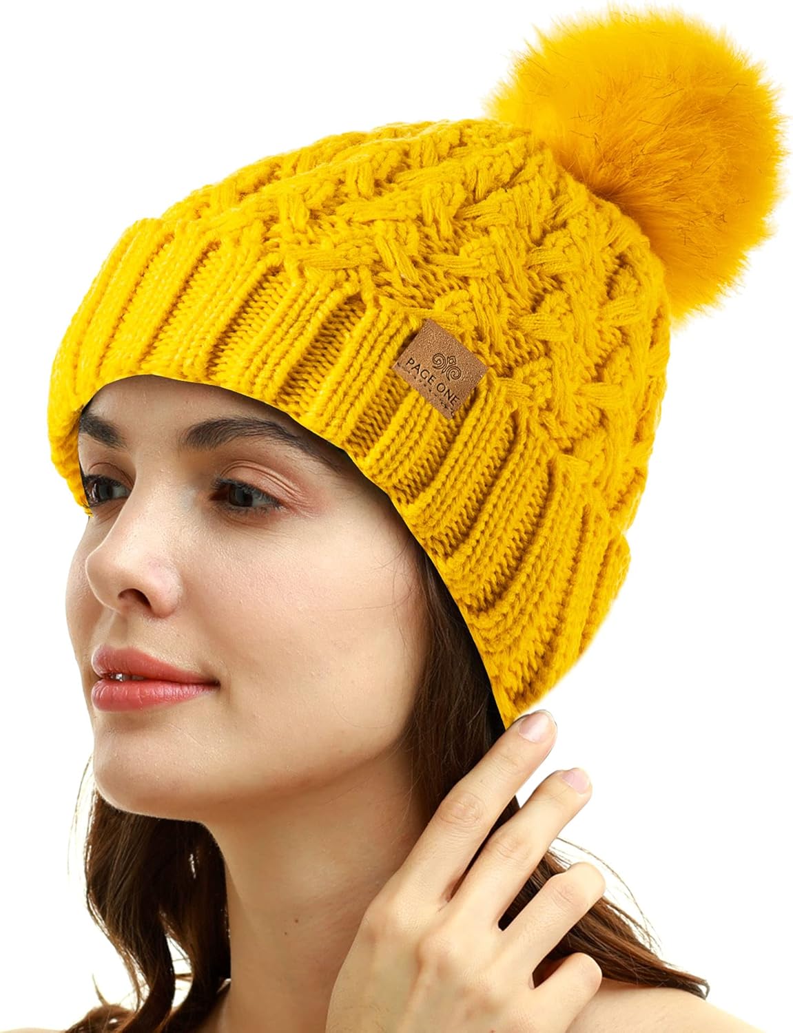 PAGE ONE Womens Winter Ribbed Beanie Crossed Cap Chunky Cable Knit Pompom Soft Warm Hat