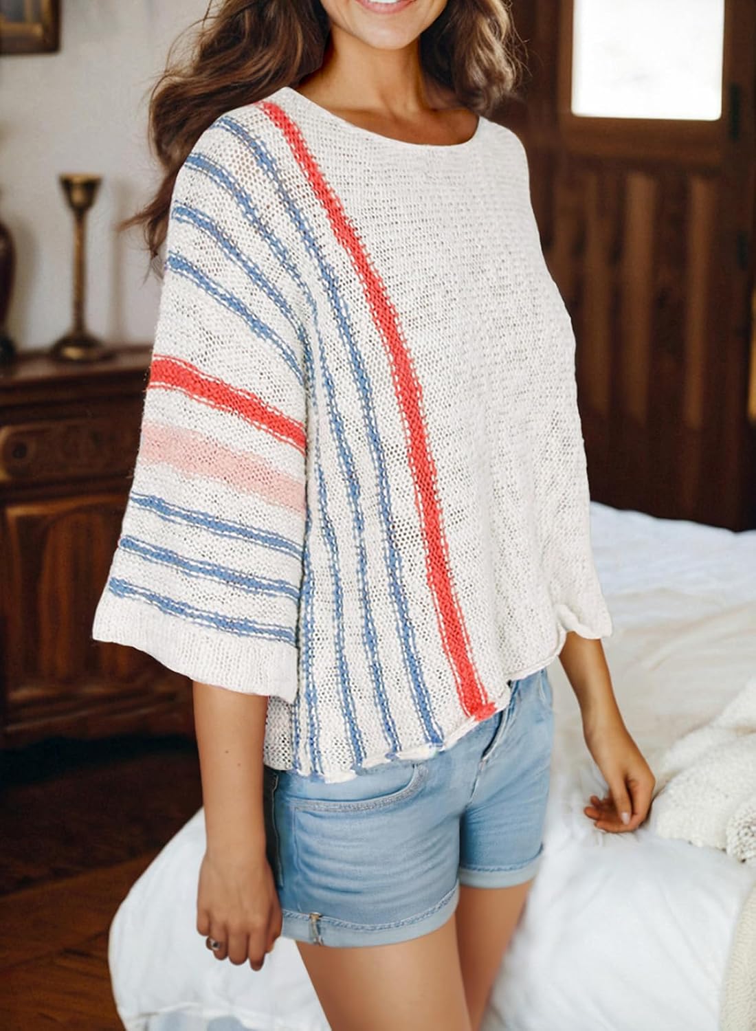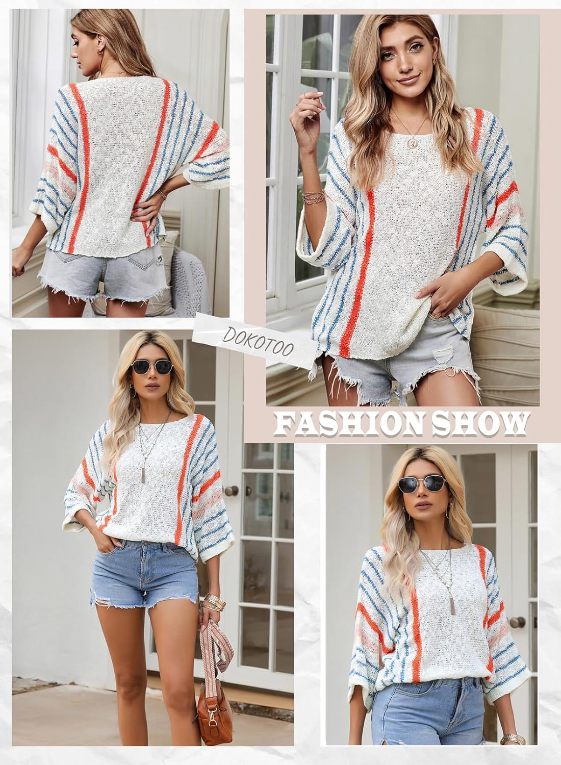 Dokotoo Womens 2025 Summer Casual Color Block Striped Lightweight Comfy Cable Knit Trendy Boho Clothes Pullover Sweaters