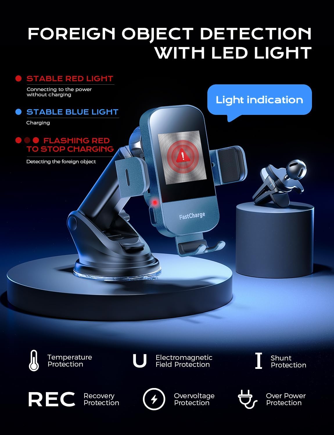 【Foreign Object Detection With Led Alarm】Our wireless car phone charger prioritizes your phone's safety. If a metal substance is detected between the charger mount and your phone, it immediately stops charging and flashes a red light to alert you. This innovative feature effectively prevents damage caused by metal-induced high temperatures.