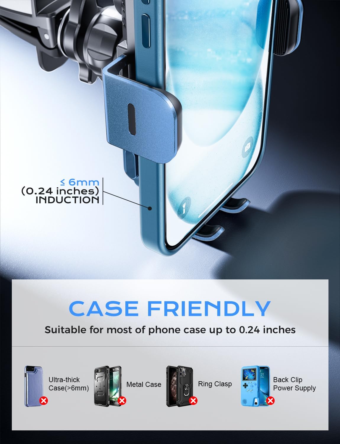 【Case Friendly & Flexible Angle Adjustment】Enjoy hassle-free charging through phone cases up to max 4mm(0.16 inch) thick with our CHGeek phone holder for car. Please note that metal cases, magnets, credit cards, grips, and stands may interfere with charging. For optimal viewing and safe driving, the 360° rotating sphere and retractable & foldable bracket allow you to adjust the angle to your preference. The Otterbox phone case is too thick, causing it to be incompatible with this wireless charger.
