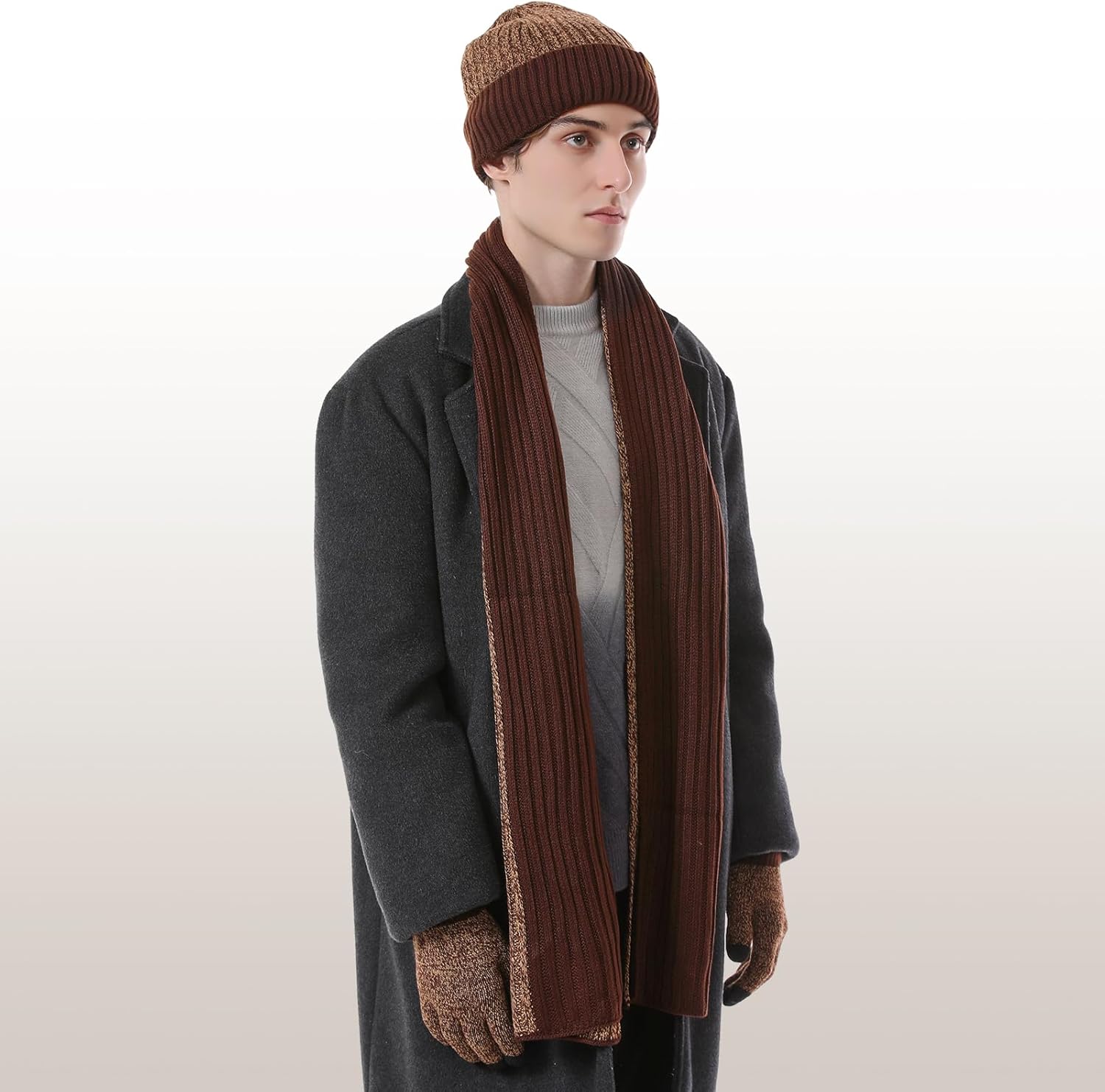 A Best Gift for Christmas Thanksgiving Day New Year -- Knitted Winter Hat, Men's Scarves and Touchscreen Gloves Combination Fit Your Winter Dress Up.You Can Present this Perfect Winter Knitted Set to Your Relatives or Good Friends and Enjoy the Good Time in Winter
