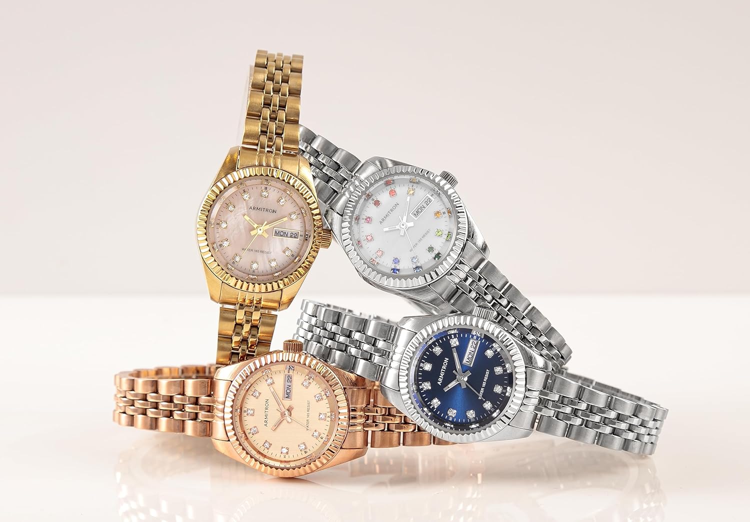 Light pink mother-of-pearl dial with day/date calendar window; gold-tone hands and clear crystal markers; black outer minute track
