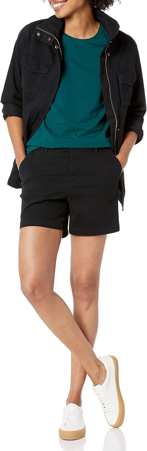 CLASSIC KHAKI SHORT: These classic Khaki shorts are the ultimate summer style. Offering a clean, gently structured silhouette, these shorts also fit with comfort and ease for at work, weekend exploring, or running errands. Complete your look with Amazon Essentials Women's Sneakers or Sandals.