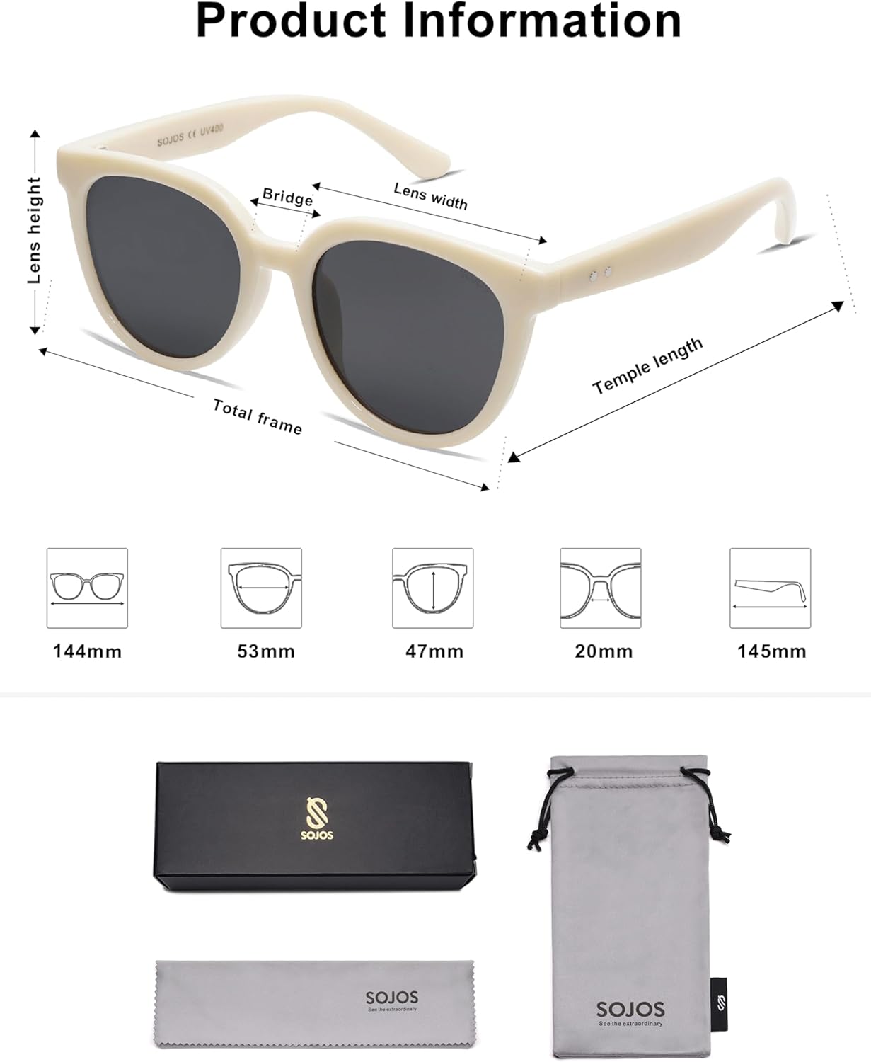 PRODUCT DIMENSION – Lens Width: 53mm(2.09inches) | Lens Height: 47mm(1.85inches) | Temple Length: 145mm(5.71inches) | Nose Bridge: 20mm(0.79inches).
