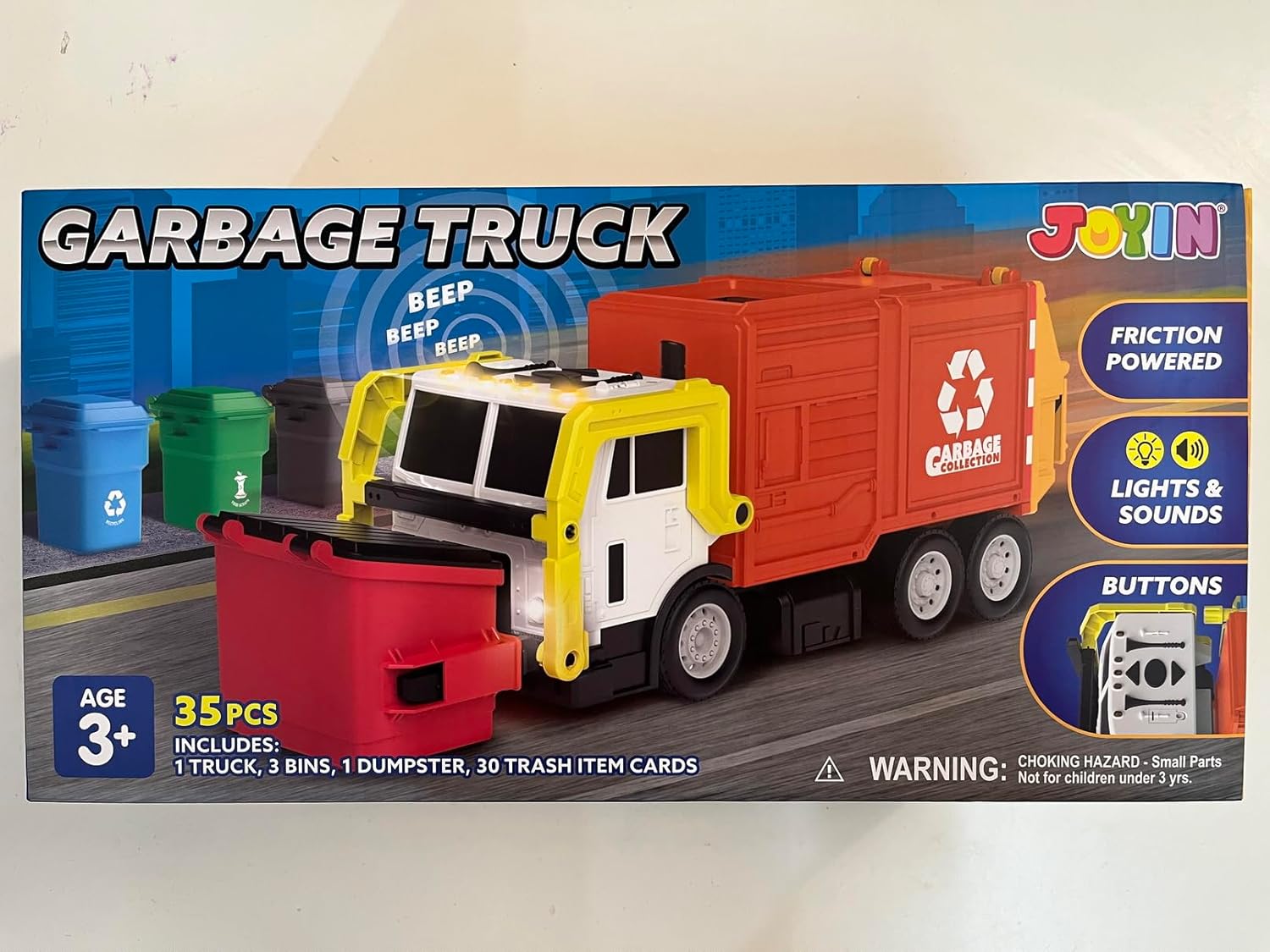 MULTIFUNCTIONAL LARGE GARBAGE TRUCK TOY: Our Front Load Garbage Truck Toy is designed with front dumper dumping function, side lifting, and rear trunk trash bin dumping parts. This trash truck set comes with 1 friction powered Truck, 1 Dumpster Container, 3 Color Printed Trash Bins (Recyclable, Trash, Food Scraps ), with 3 Mini Trash Learning Cards (30 pcs Trash Images in total). This is an interesting toy set for your kids to develop their fine motor skills while having fun