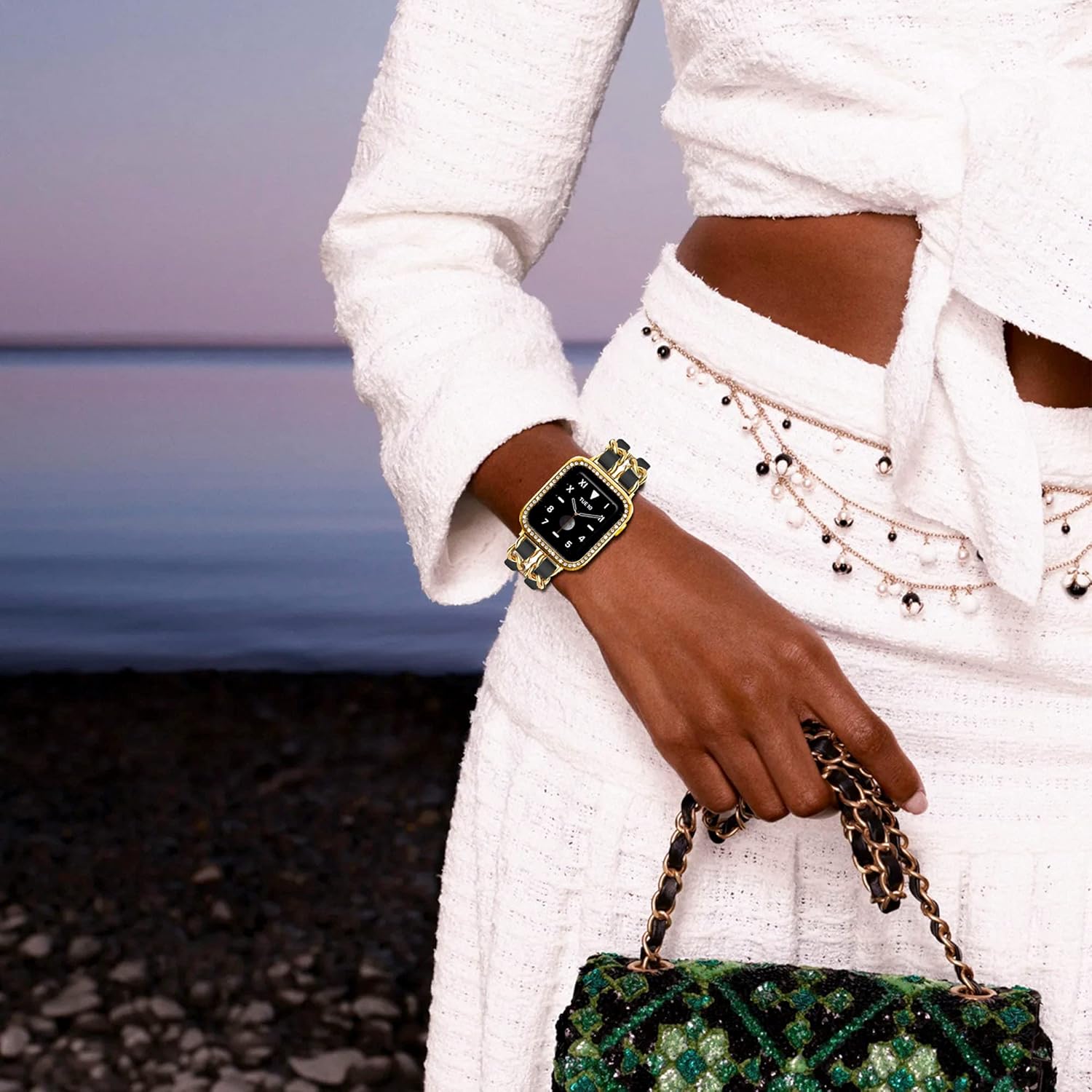 Premium Material: Made of superior metal and leather strap, with well polishing and smooth chain line design, which keep the band no sharp edges, water/sweat-proof, robust and comfortable to wear. The bling protective cover built-in 0.33mm Ultra-Thin HD Clear tempered glass screen protector, all around protects the Watch from scratch, bumps and accidental drops. High sensitive touch keep your watch preserving the original touch sensitivity