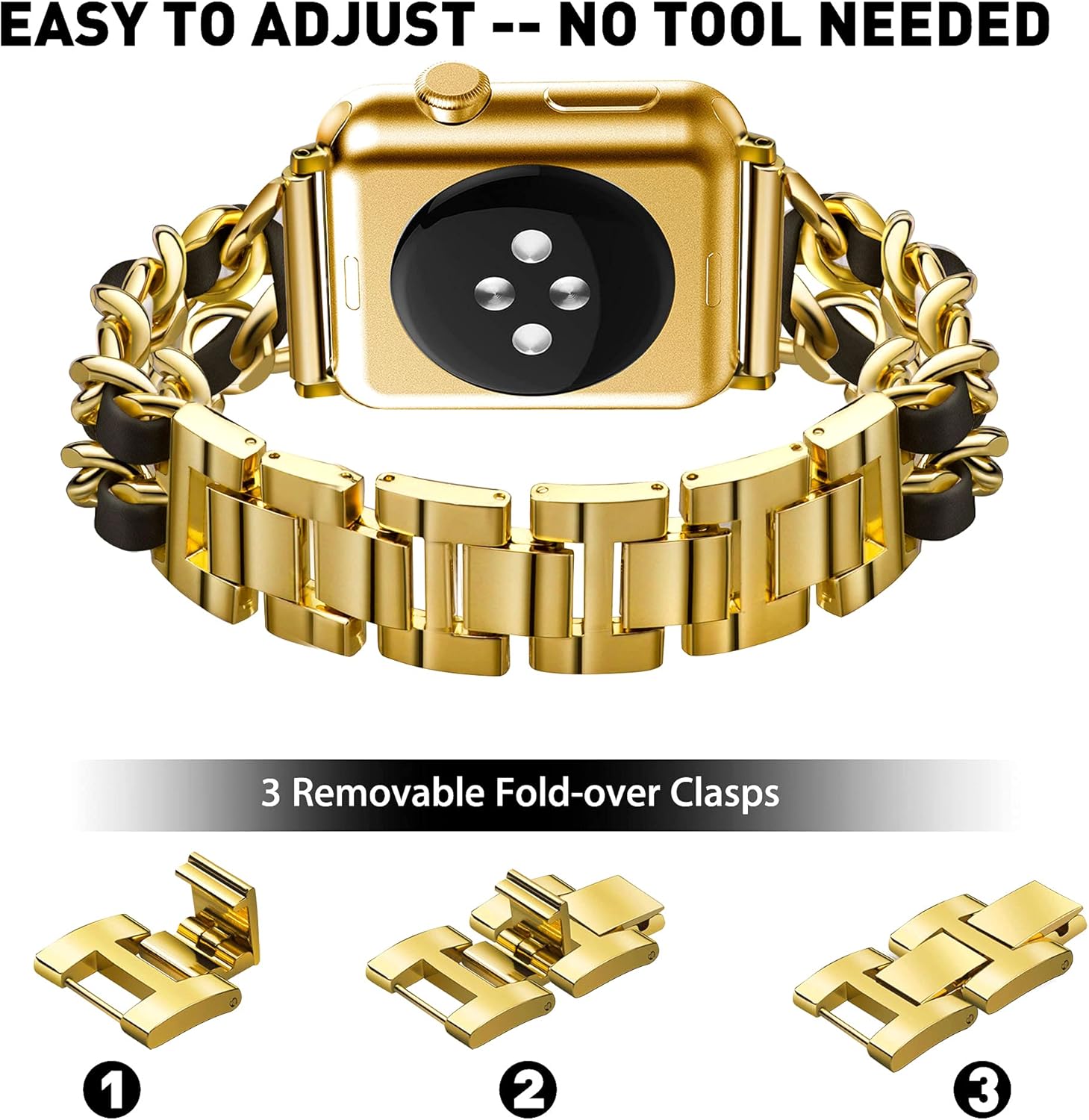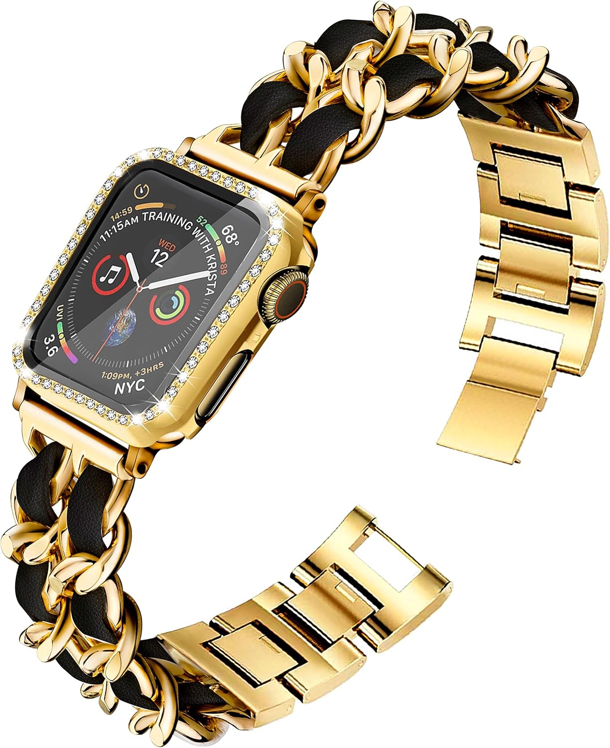 Pretty Chunky Chain Design: The bracelet adopts unique metal chain and leather strap cross weaving design, shows perfect combination of modest luxury and classic elegance. Matching up a bling protective case, felicitously protect and embellish your watch