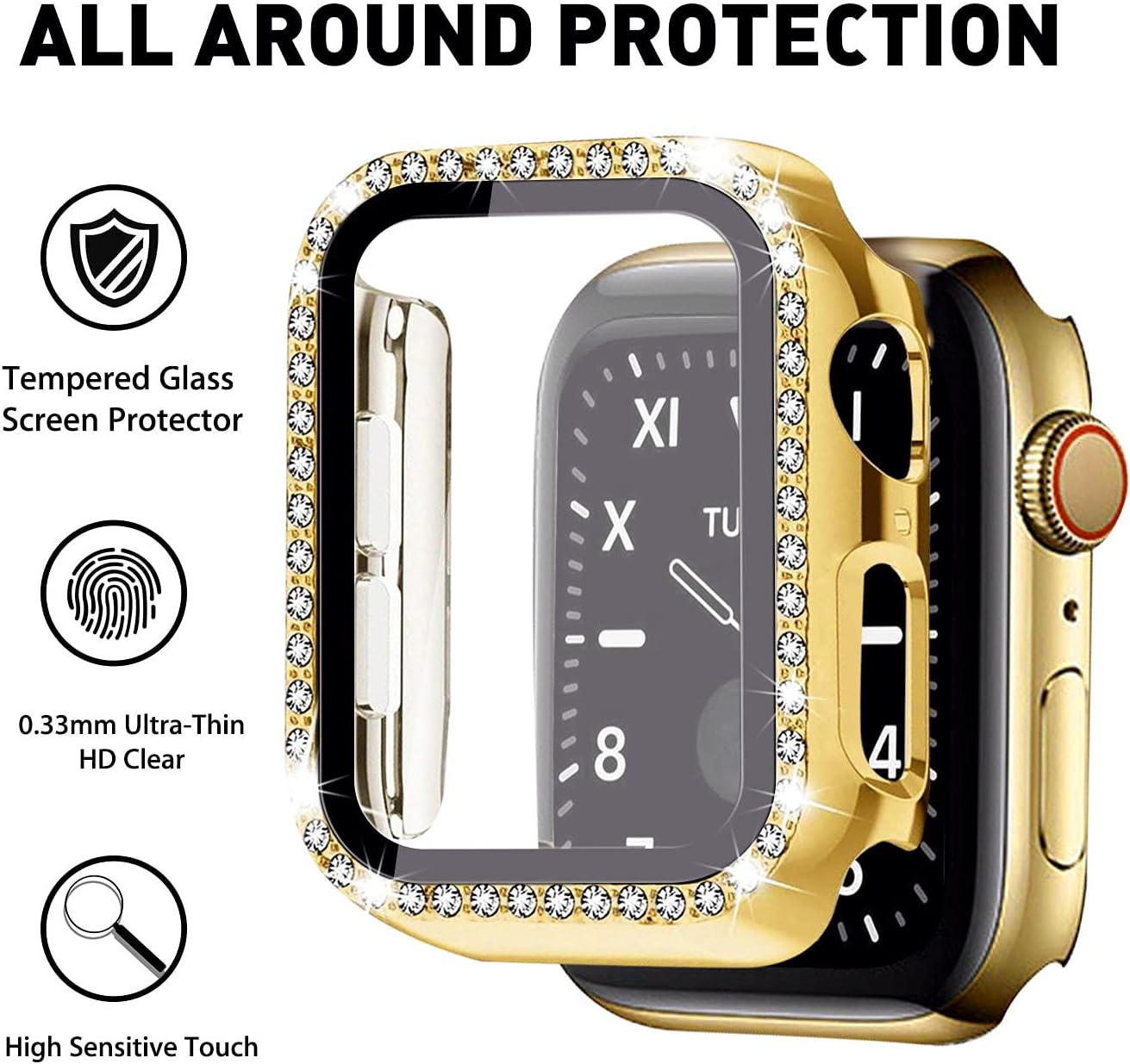 Easy to adjust -- No Tool Needed: The chain band adopts 3 folding clasps, you could easily remove the extra links for the watch band to fit your wrist perfectly. The bling protective watch cases with Precise Cutouts for functional buttons and ports, you can easy snap on and take off the case, Do not affected the band insertion or watch charging