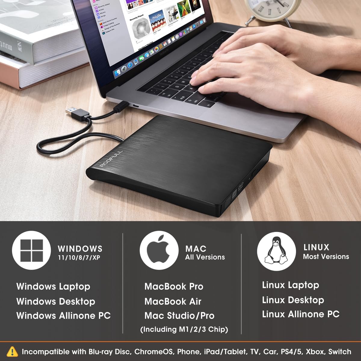 【Wide Compatibility】This USB external DVD drive for laptop PC is effortlessly compatible with Windows 11/ 10/ 8.1/ 7/ Vista/ XP/ 98/ SE/ ME/ 2000, Linux, and Mac OS X (media player and network required for Windows 11/12). It seamlessly complements a variety of laptops, notebooks, desktops, and all-in-one computers from renowned brands like HP, LG, SAMSUNG, ASUS, DELL, Lenovo, ThinkPad, Microsoft, Apple MacBook, and more. It supports reading and writing CD±R, CD±RW, CD-ROM, DVD±R, DVD±RW, DVD-RAM, VCD, and SVCD discs. (Note: Blu-ray and 4K discs are not supported, and it cannot work with ChromeOS, TV, Car, Projector, Phone, iPad/Tablet, PS4/5, Xbox)