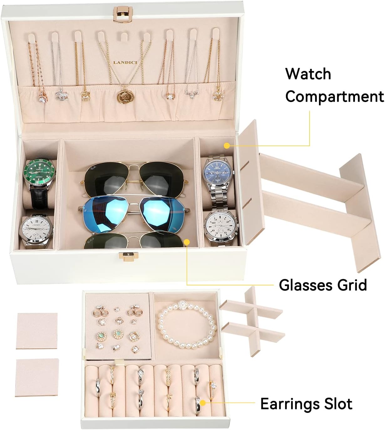 Adjustable Watch& Glasses Layer on Bottom- 4 dedicated watch storage box compartments and covered in silky-soft velvet,and there're 3 pairs of glasses compartments,keeps your items protected from dust and moisture.