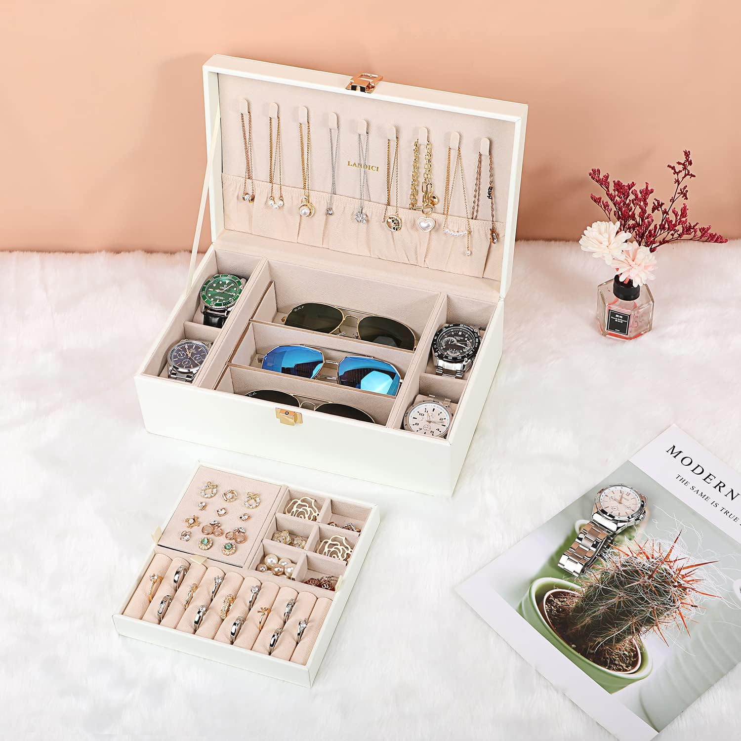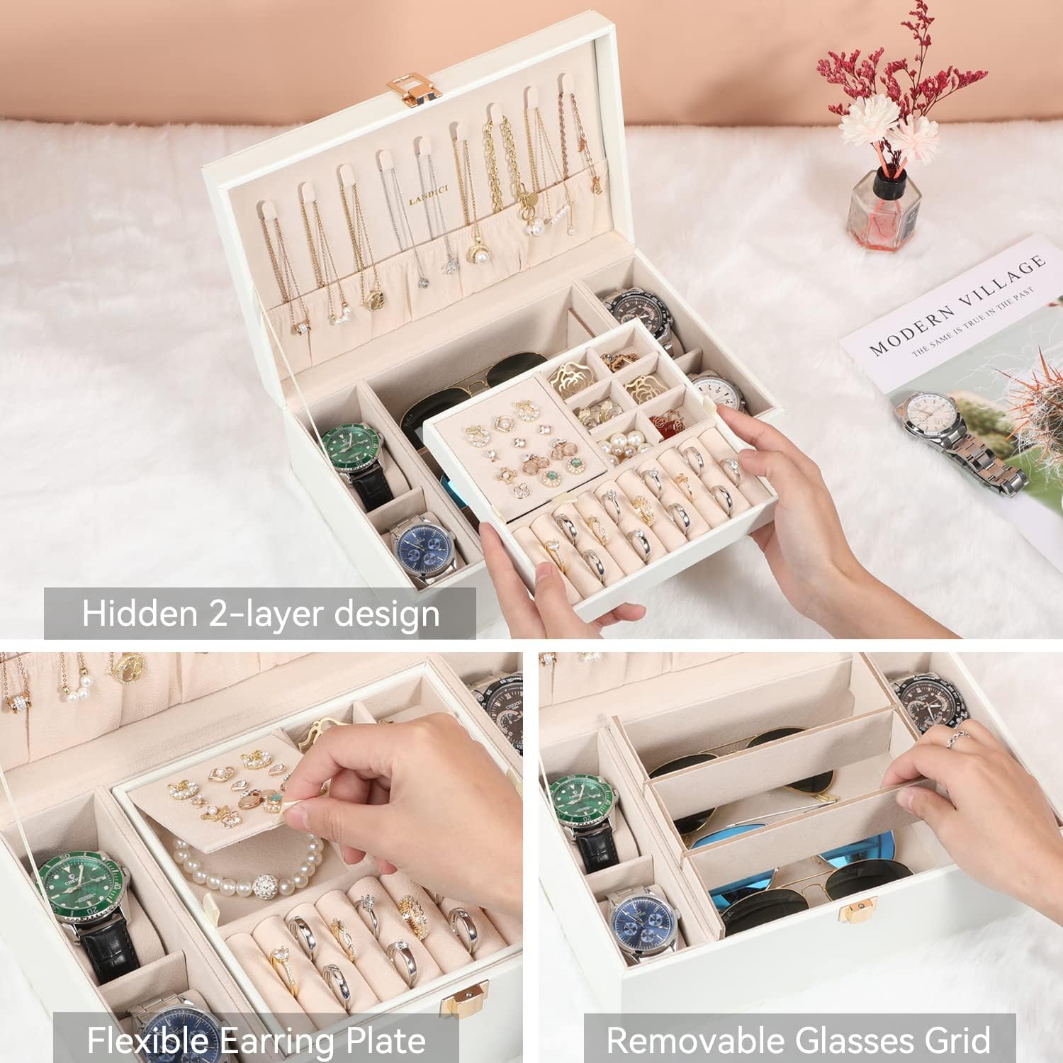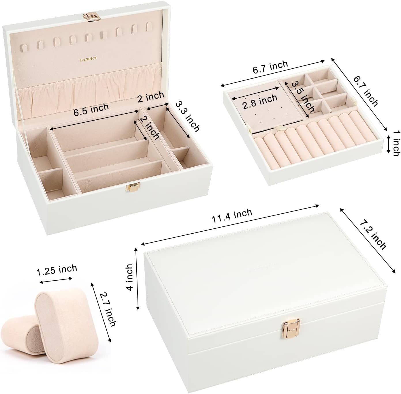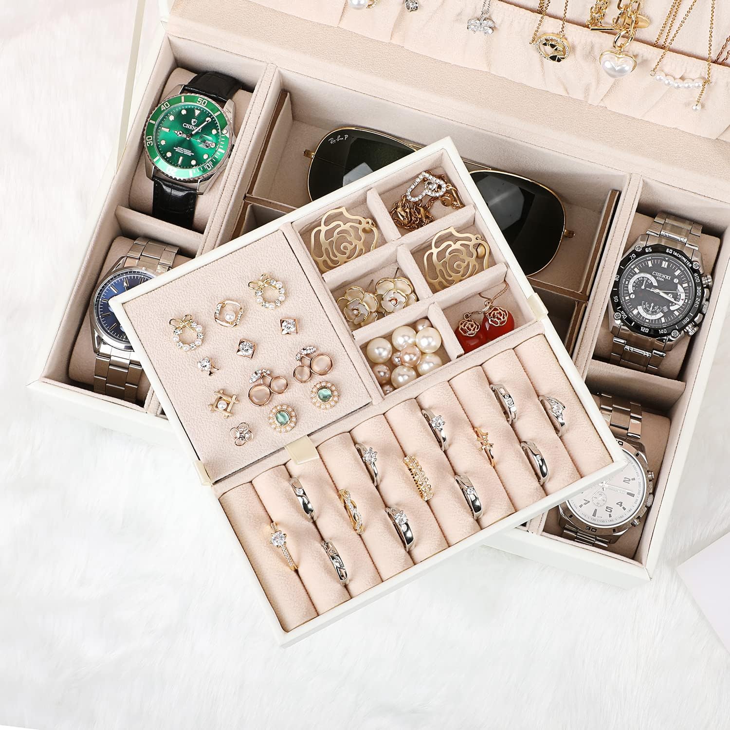 Separate Jewel Tray - It has 3 Compartments includeing 1 ear stud plate(Special double-sided 12 ear studs or earring holes design),connect with 1 ring area(hold 9 pair of rings),1 removable cross divider for storing jewel in various size and shape and protect your beloved jewelry from scratch and damage.