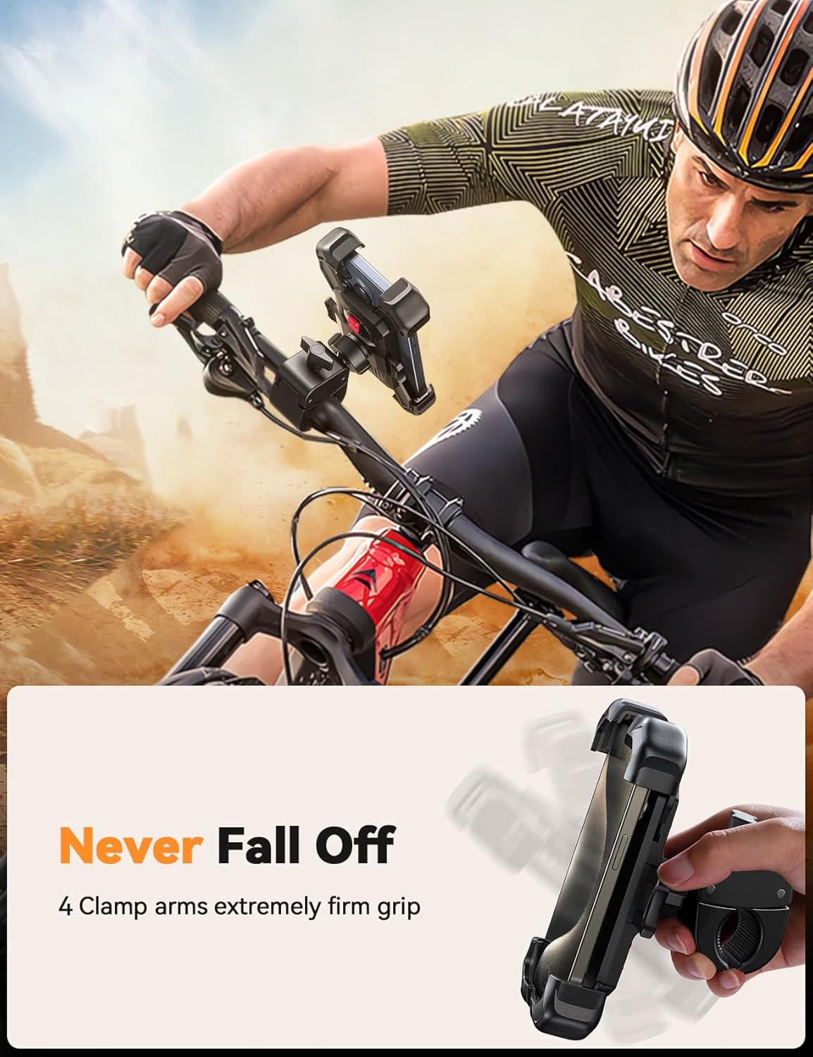 1 Click, Auto Lock- 2022 latest motorcycle phone mount features with a upgraded auto lock button. 4 arms will auto lock your phone with a click, and unlock by pressing both side. Real one hand operation. Thanks to the solid structured inner mechanism, the lock button won't get stuck (tested to stand with 3000+ times press)