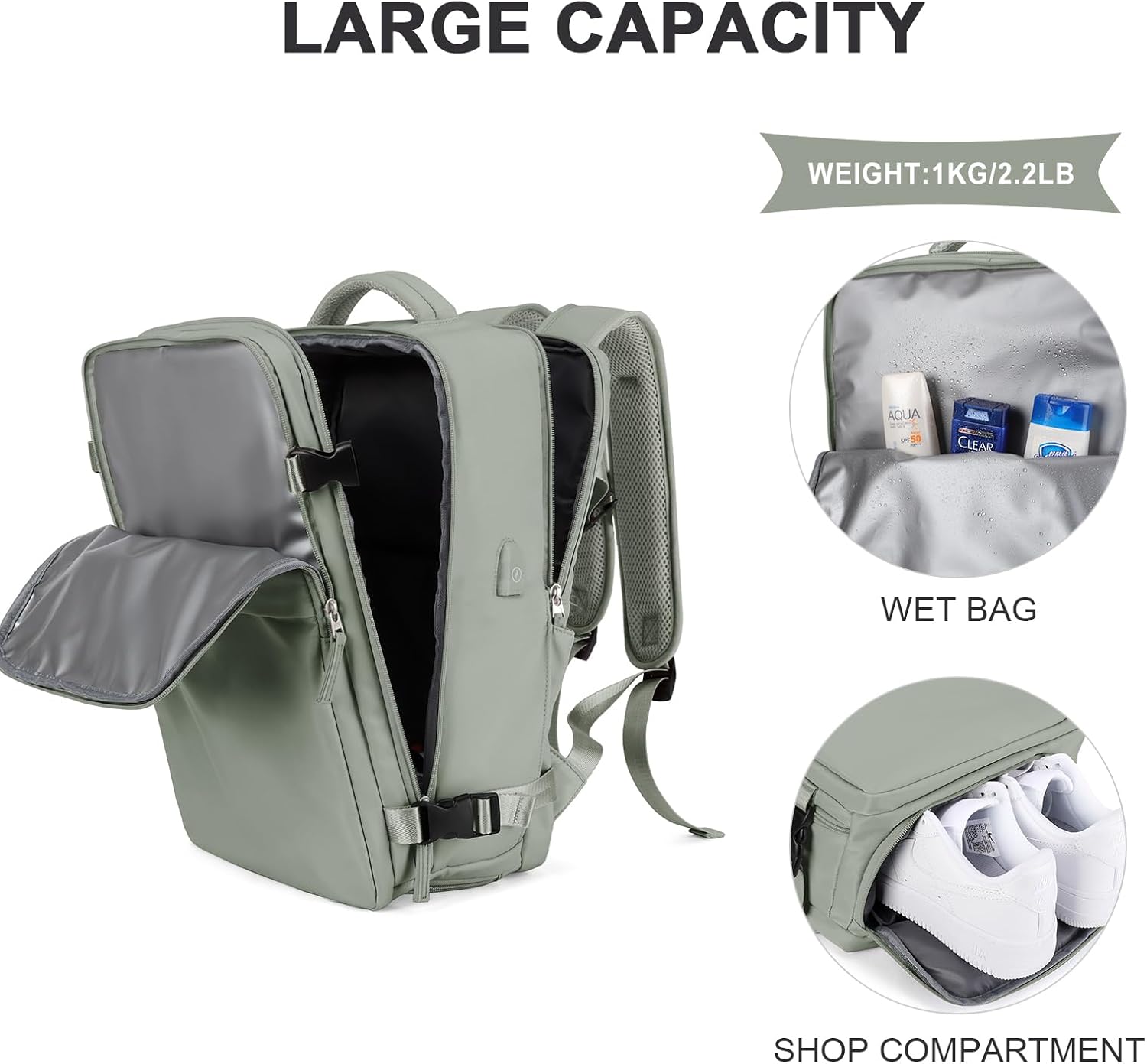 【Separate Shoe Compartment Design & Wet Bag】Main pocket x 3, laptop compartment x 1(fit for 15.6 inch laptop respectively), and many other pockets for different purposes. The wet bag is made of high density water resistant material can help you to separate dry items and wet items,if you have wet clothes or towel,you can put it in wet bag. A separate shoe compartment can help you carry and keep your shoes better in your travel bag.