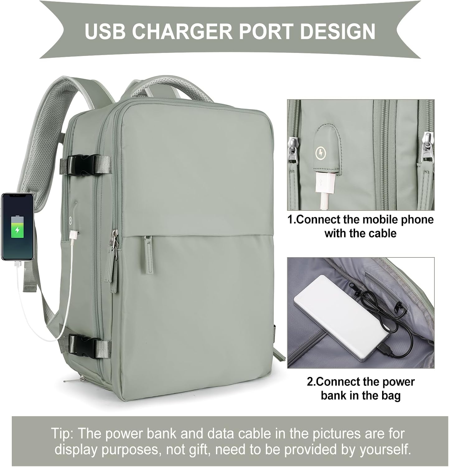 【USB Charging Port】With built-in charging port enable to charge your phone anytime and anywhere.( The power bank and data cable in the pictures are fodisplay purposes,not gifts, need to be provided by yourself)