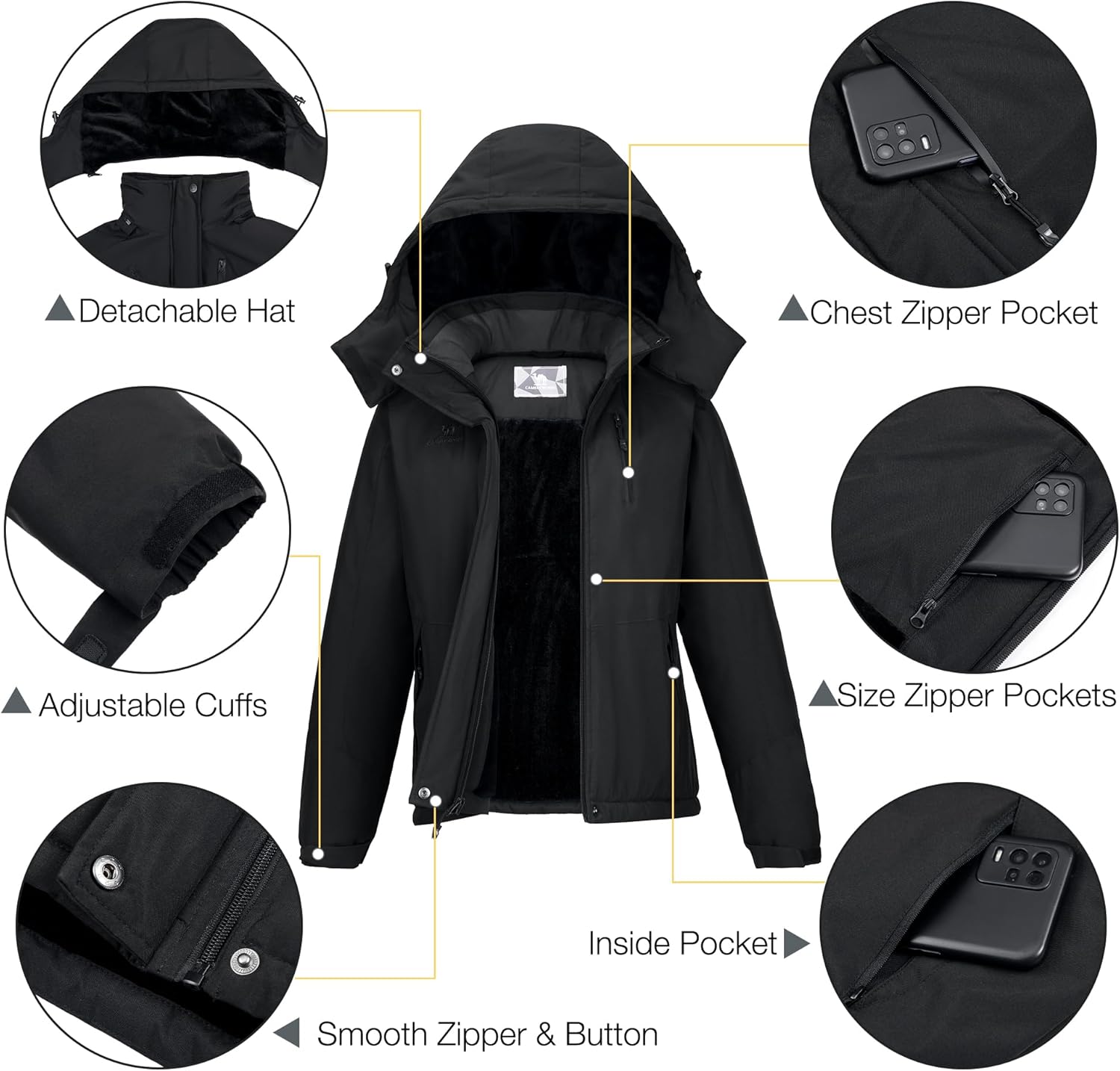 ❄Waterproof & Stain-repellent: CAMELSPORTS ski jacket women are made with technologically waterproof fabric with 10000mmH2O waterproof index and all the zippers are waterproof design. It is fully sealed to prevent water and stain from seeping inwards so that let you easily deal with outdoor rainstorm climate calmly such as heavy fog, rainy or snow day.