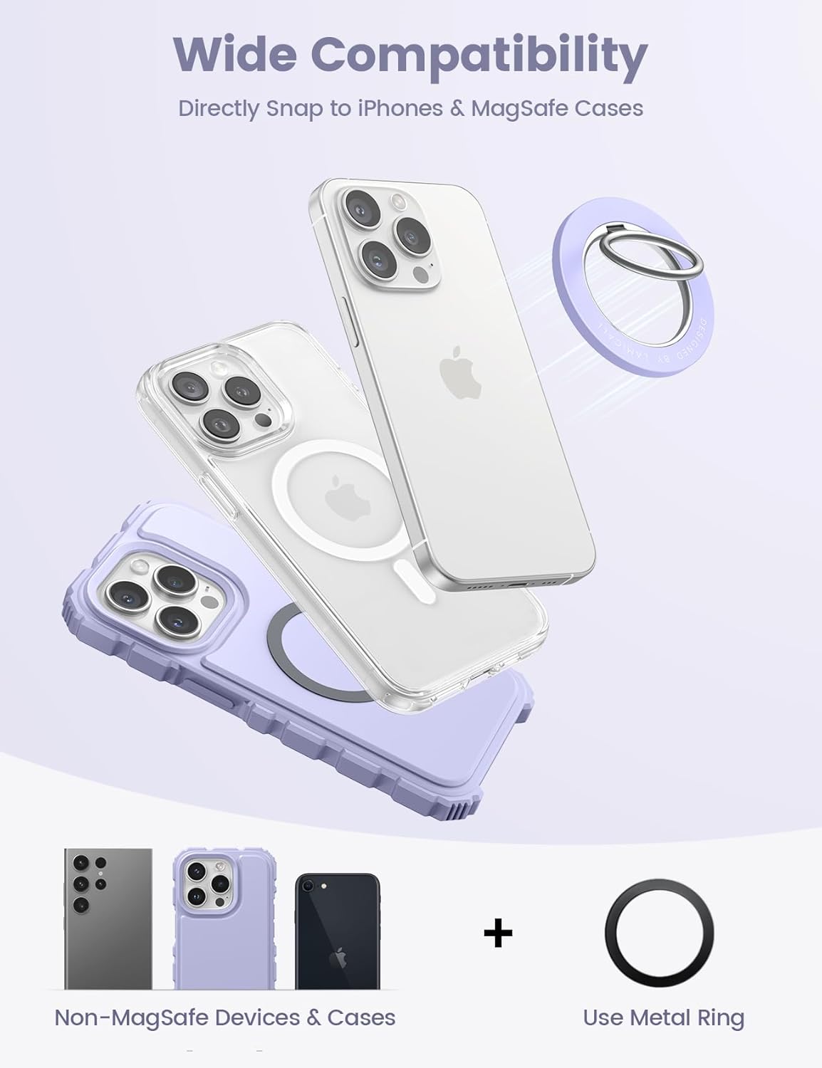 ??【Wide Compatibility】 This mag safe holder can snap directly to iPhone iPhone 14, iPhone 14 Plus, iPhone 14 pro, iPhone 14 pro max, 13, 13 Pro, 13 Pro Max, 13 Mini, iPhone 12, 12 Pro, 12 Pro Max, 12 Mini or Mag Safe magnetic cases. Magnet will stronger if use metal ring. ❗❗If use Non-Magnetic Regular iphone cases, you have to use metal ring to enhance magnet.