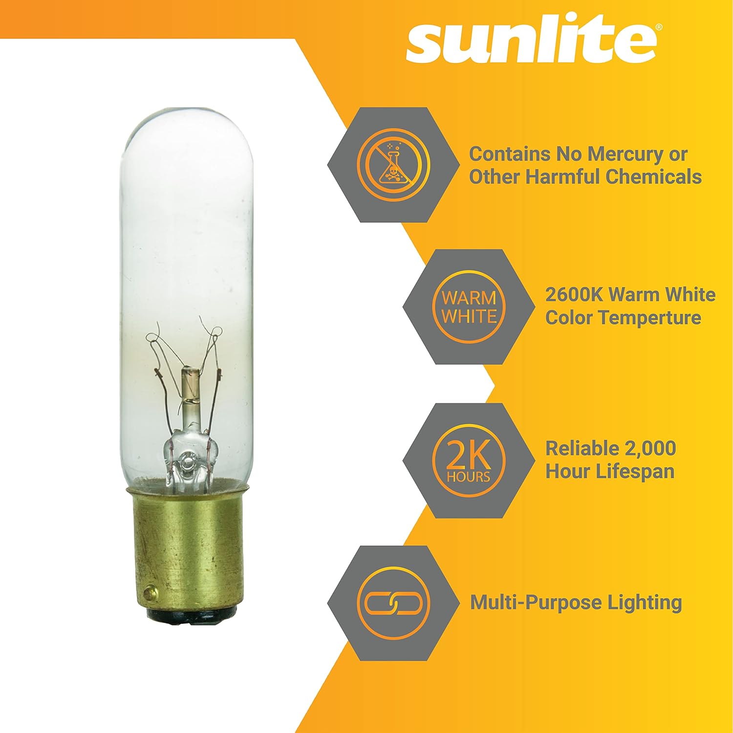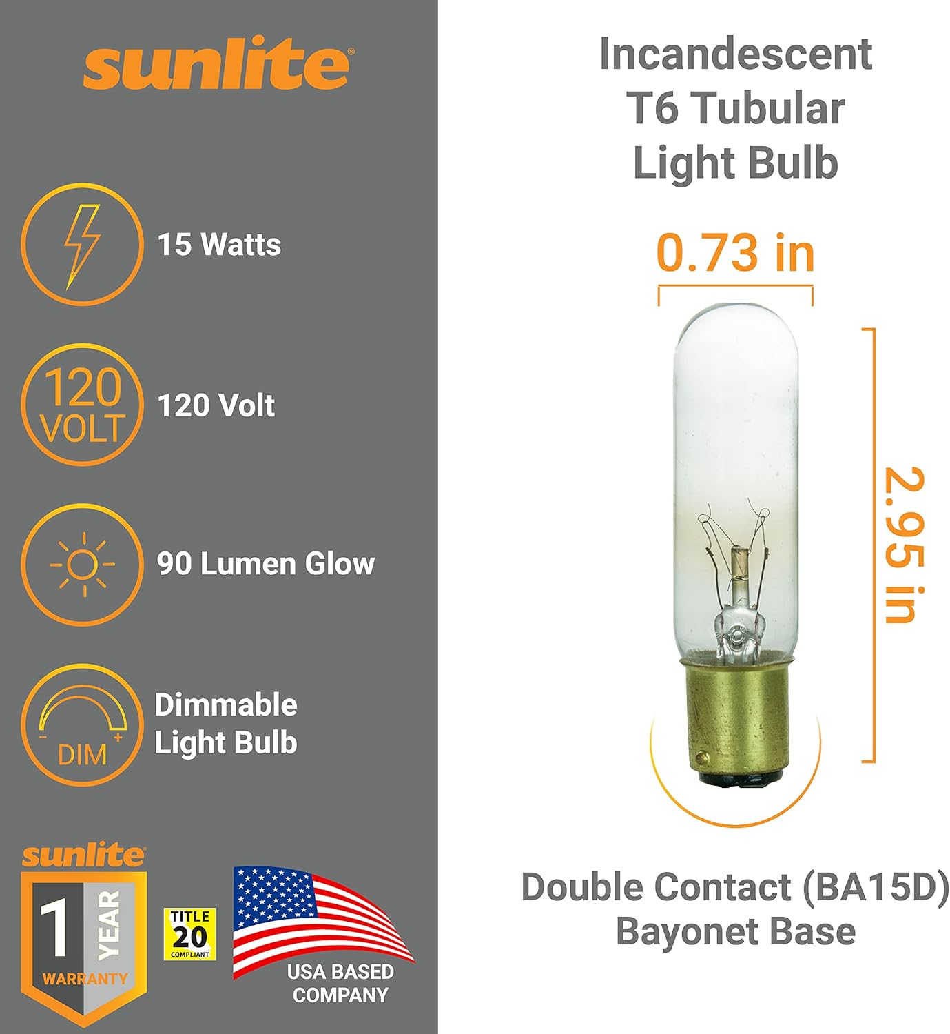 Sunlite 41719 Incandescent T6 Tubular Light Bulb, 15 Watts, 90 Lumens, Dimmable, Mercury Free, Title 20 Approved, 2600K Wa...