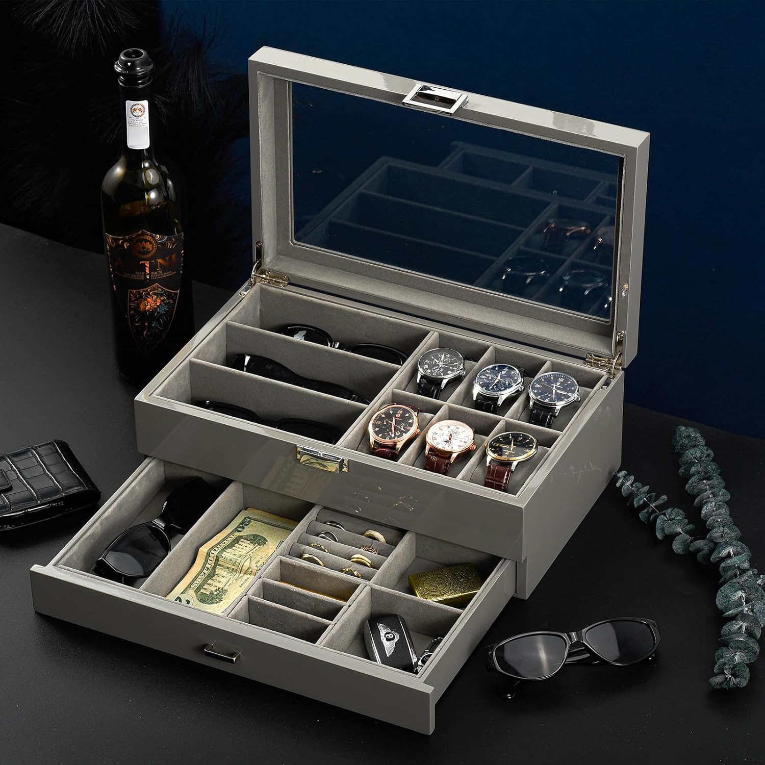 ProCase Wooden Men's Jewelry Box, 2-Tier Watch Holder and Sunglasses Box Organizer for Men, Display Cases with Clear Glass...