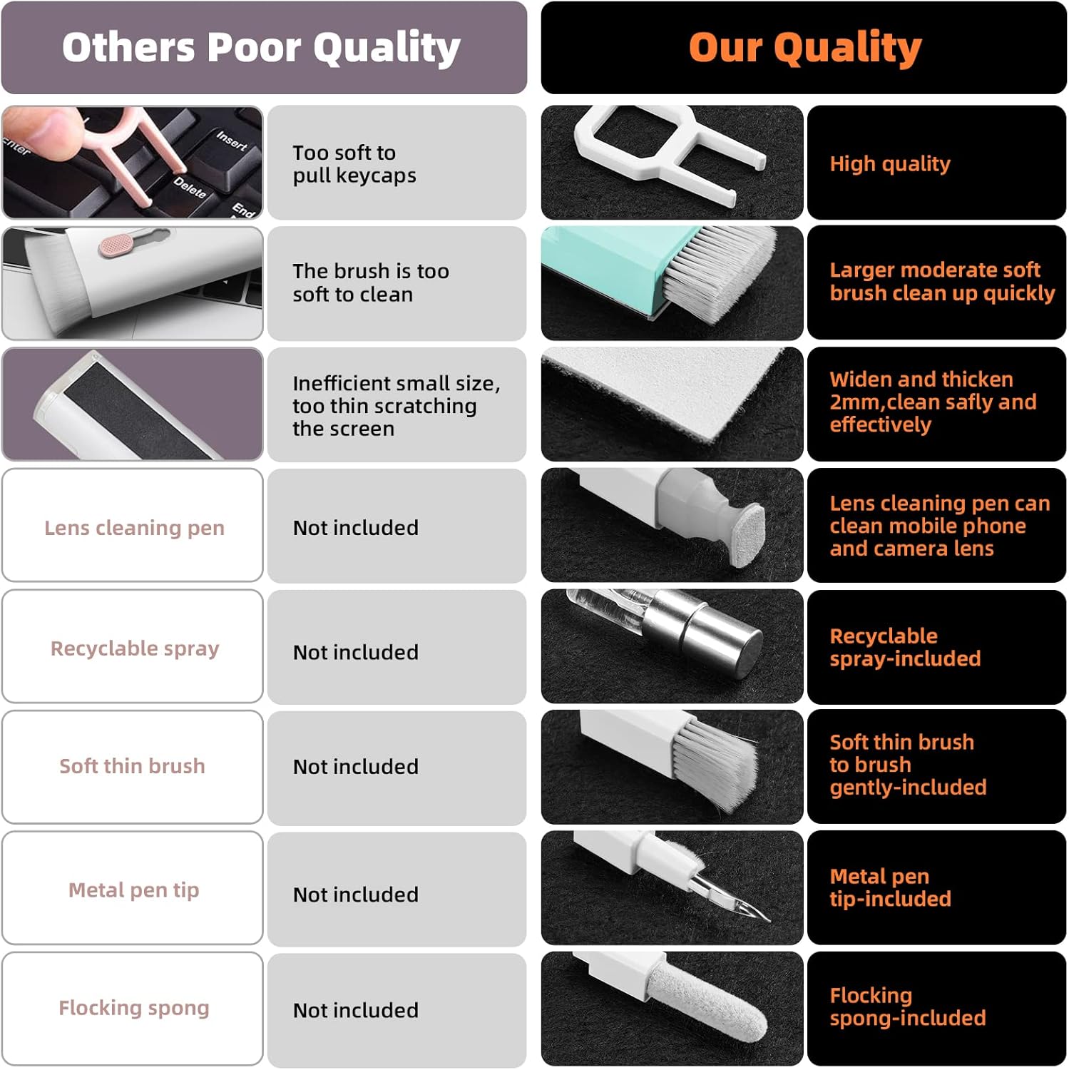 DEEP CLEAN YOUR DEVICE The electronics cleaner kit can effectively deep clean all your electronic devices such as mobile phones, tablets, TVs, etc. It comes with retractable large brush, polishing cleaning cloth X 2, keycap puller, metal pen tip, flocking sponge, thin soft brush, soft plastic lens cleaning pen, 5 replacing cloth , large cleaning microfiber cloth. It's compact so you can keep one in a drawer, one in the car or in your bag