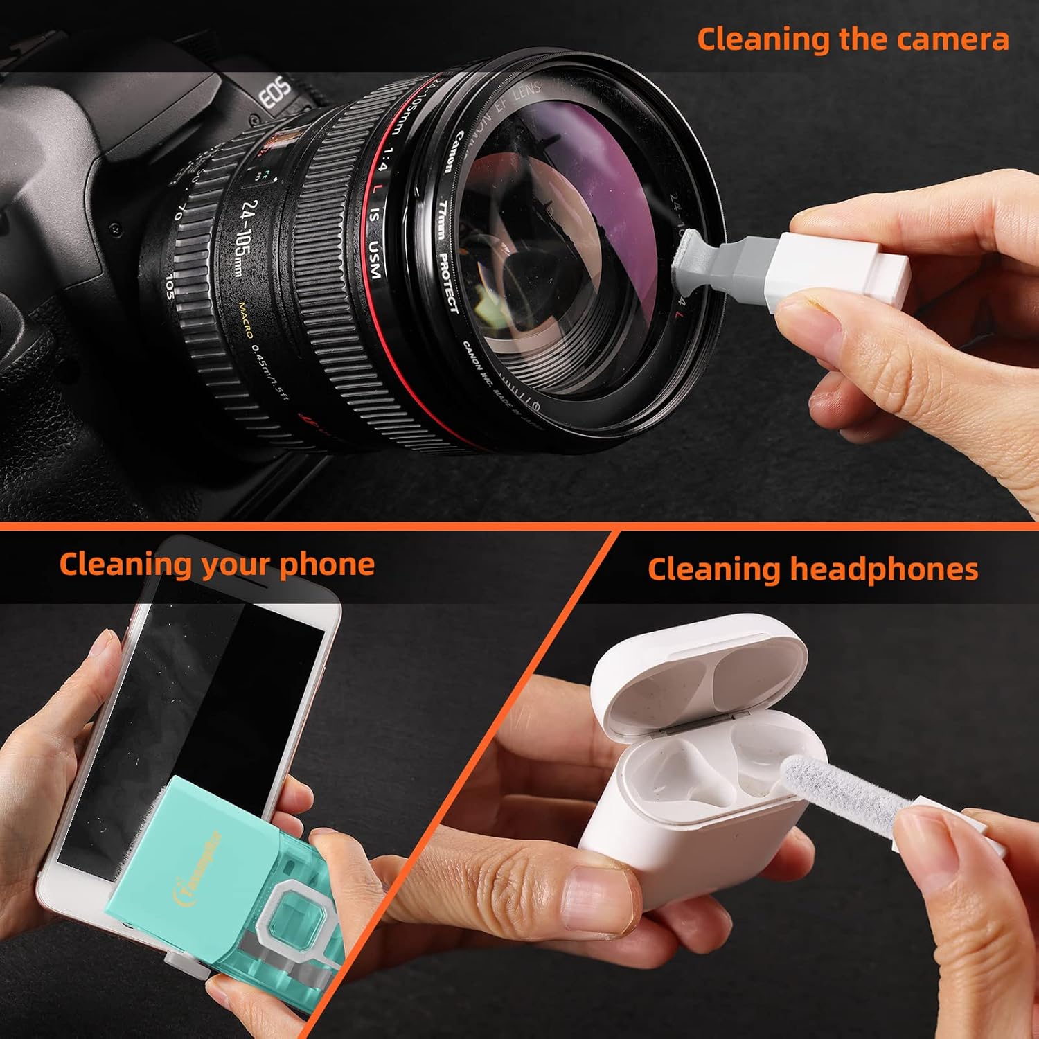 MULTIFUNCTION IN ONE GADGET Mini soft brush and Soft plastic lens cleaning pen is especially designed for DSLR camera screen, lens and other delicate surfaces. 5 more cleaning cloth of it supplied for replacing. The flocking sponge is an excellent tool for cleaning headphones charging cases, while the metal pin tip and high-density brush are ideal for cleaning the sound outlet holes on earbuds. Keep your smartphone, camera lens, laptop, headphones and other electronic accessories clean
