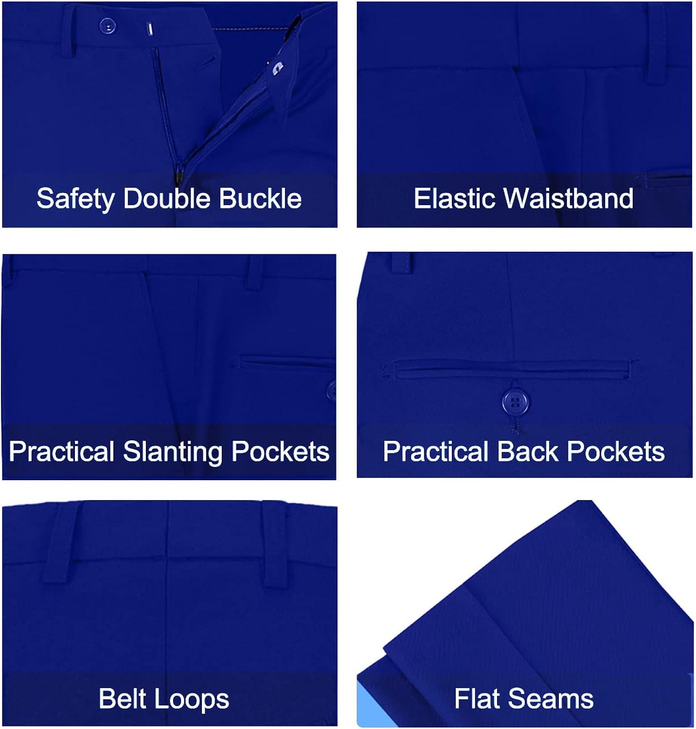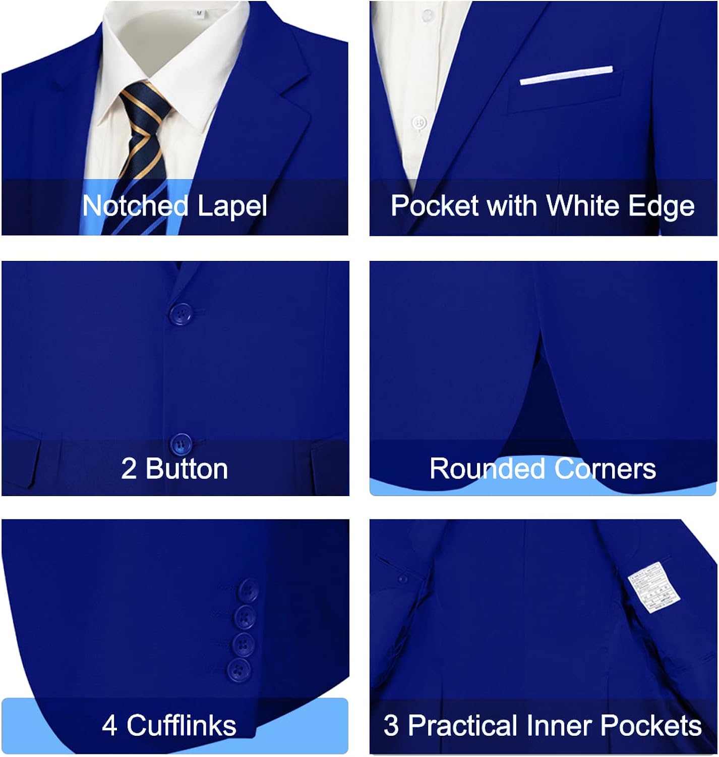 【Unique Design】: Suit Blazer: This two button single breasted blazer. Features notched lapels and double side vents. 4 cufflinks on each side. 1 false pocket with white trim. 2 flap practical pockets. 3 practical inside pockets. Suit Pants: Flat-front design. With elasticated waistband. Two slash pockets and two back pockets.