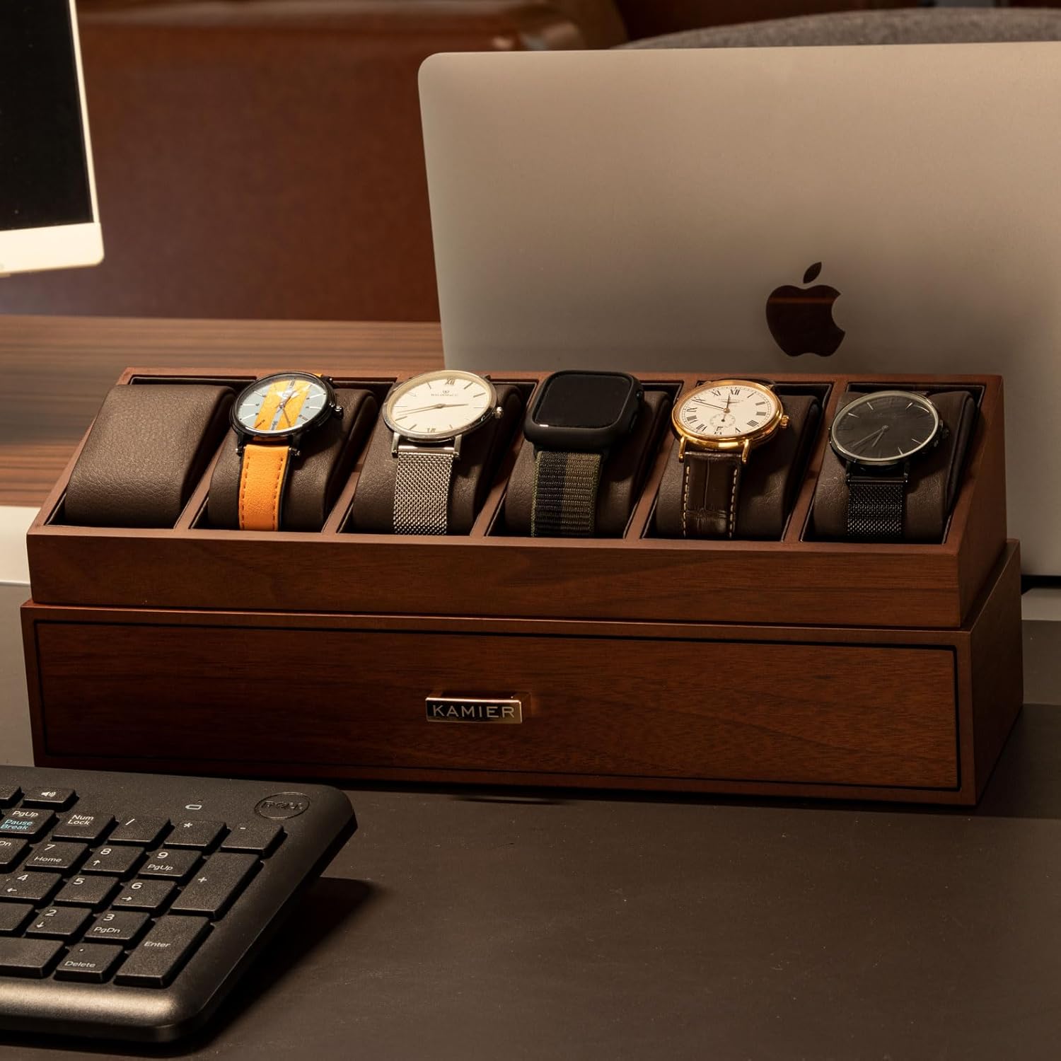 【Excellent Structure Design】The interior of this wooden watch box is covered with smooth leather to protect your watch from scratches, with 6 supportive watch pillows to hold various sizes of watches. The drawer is great for watch strap, sunglasses, rings and other jewellery storage.