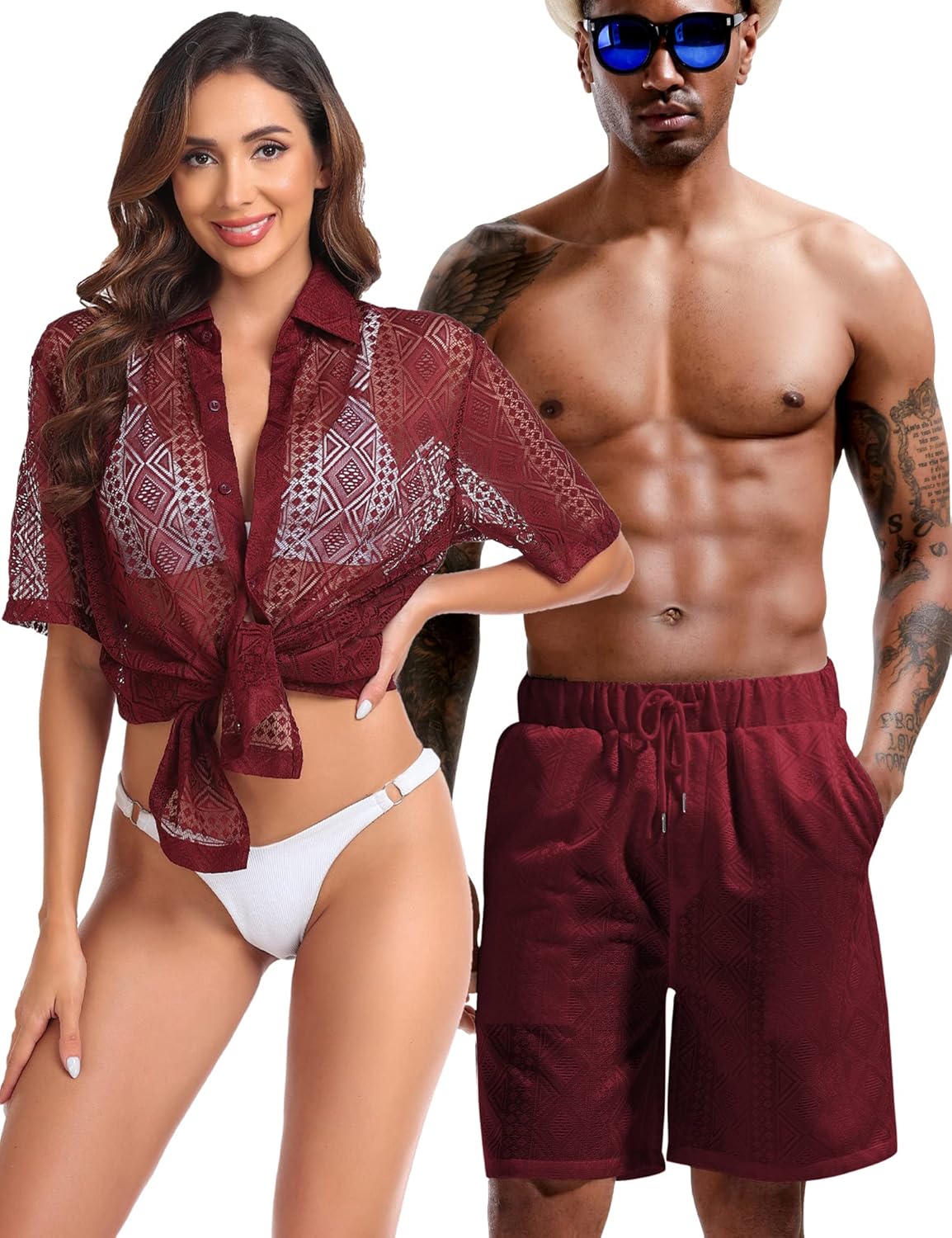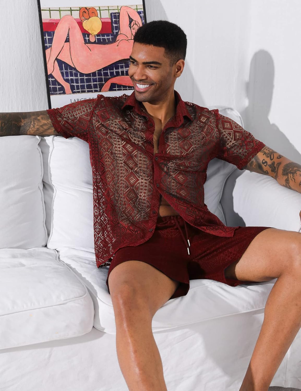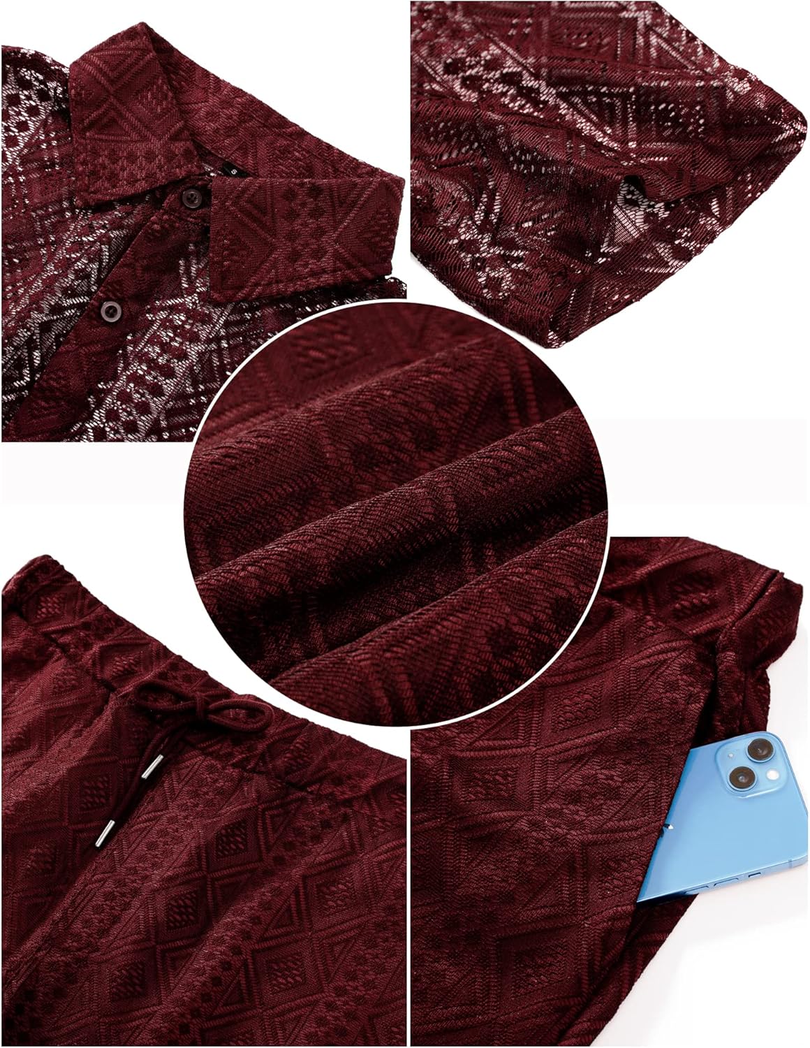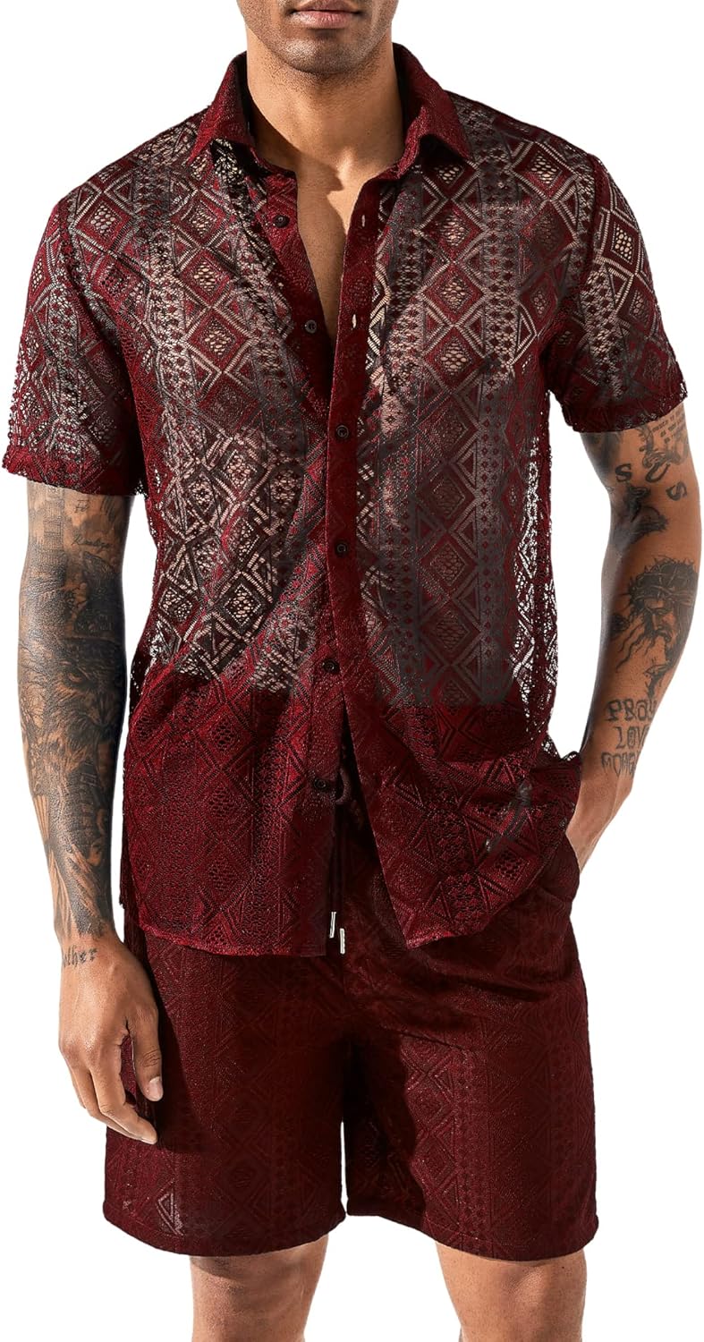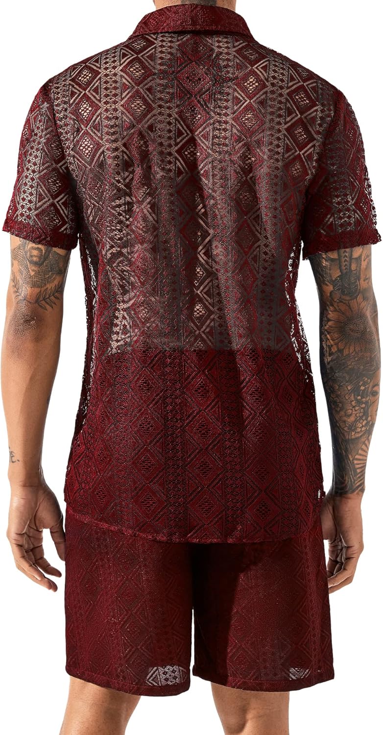 Design: See-through mens tracksuits 2 piece set, hollow out mesh shirts, button down closure, short sleeve and high-rise elastic waistband shorts, side pockets, basic solid, adjustable waist drawstring. A must-have summer outfit sets in your wardrobe!