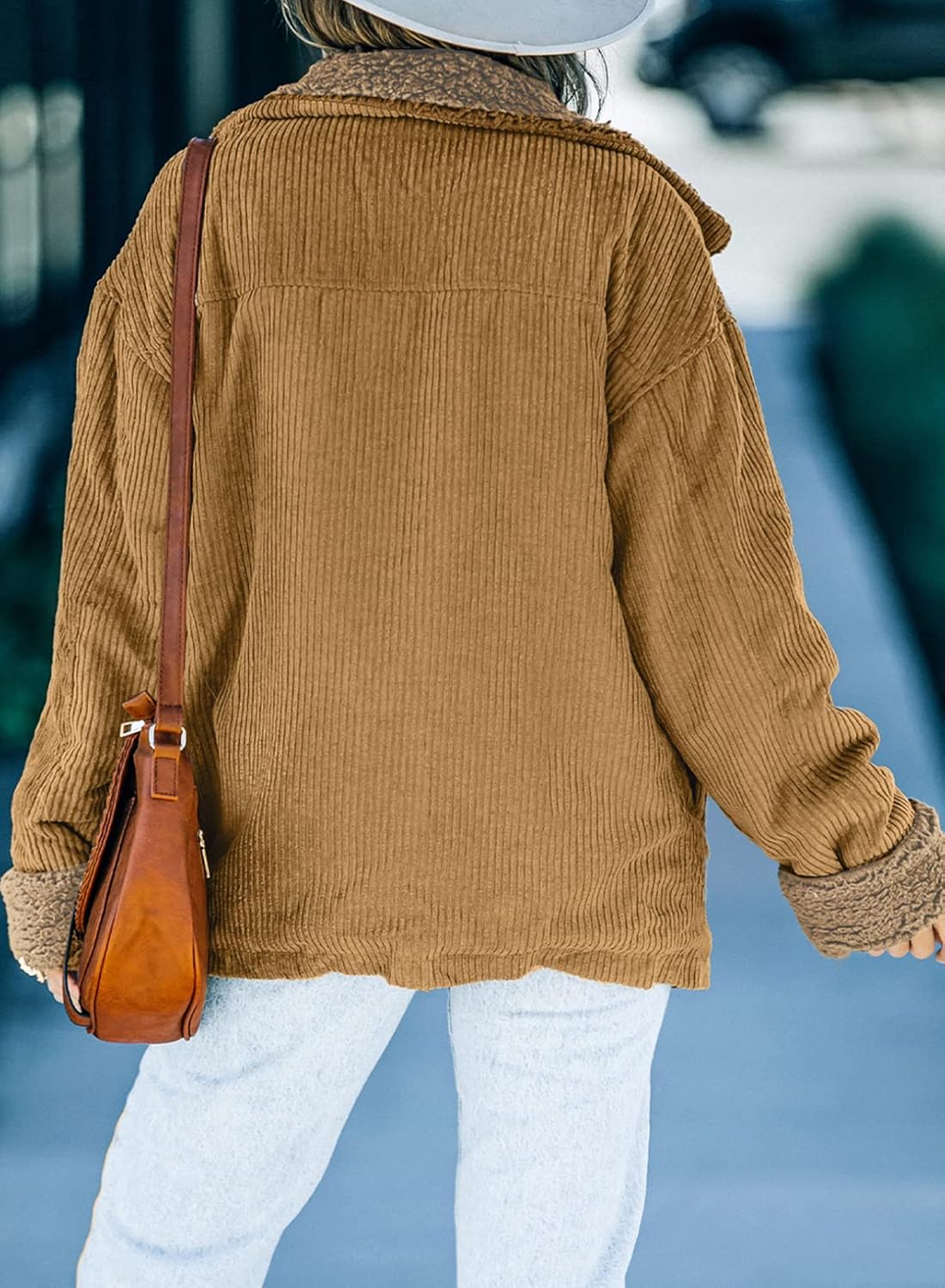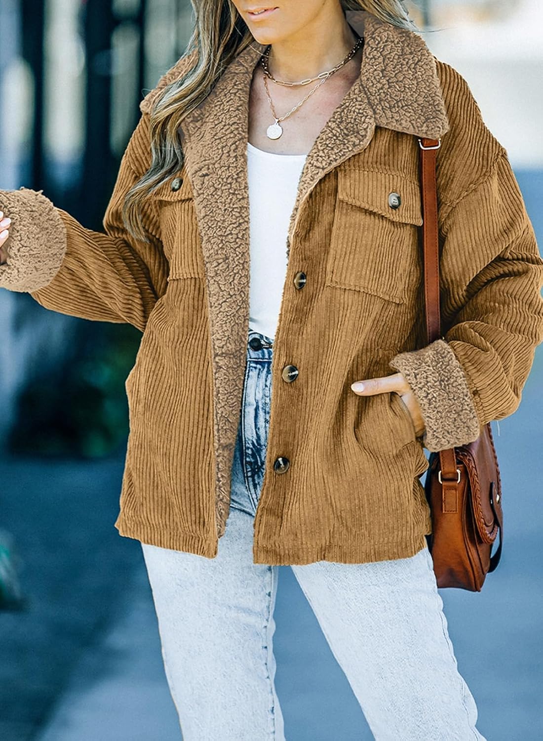Feature: Corduroy Fabrication, Sherpa lining, Solid Color, Turn-Down Collar, Front Button Closures, Bust Pockets, Welt Side Pockets, Boyfriend Style, Loose Fit Jackets