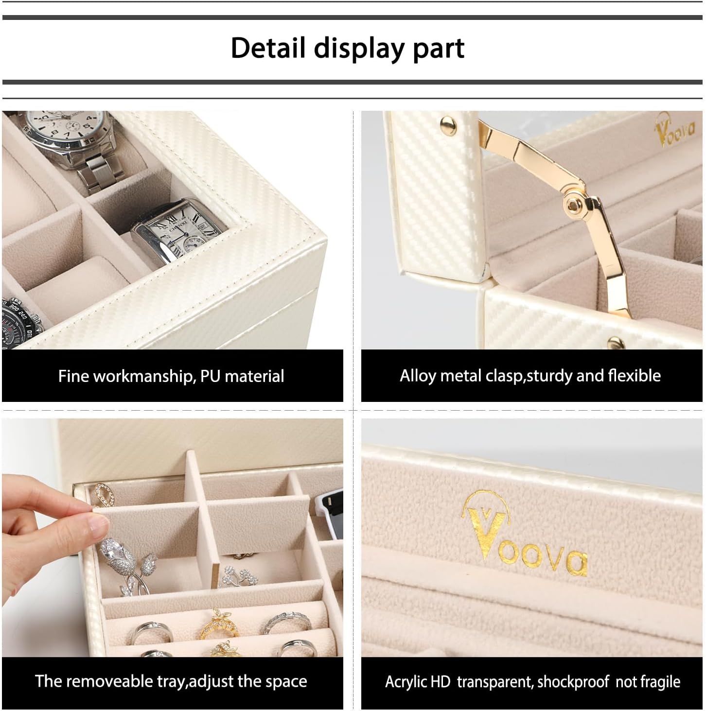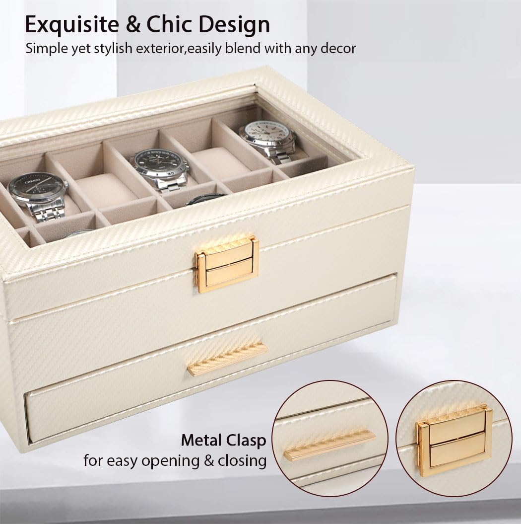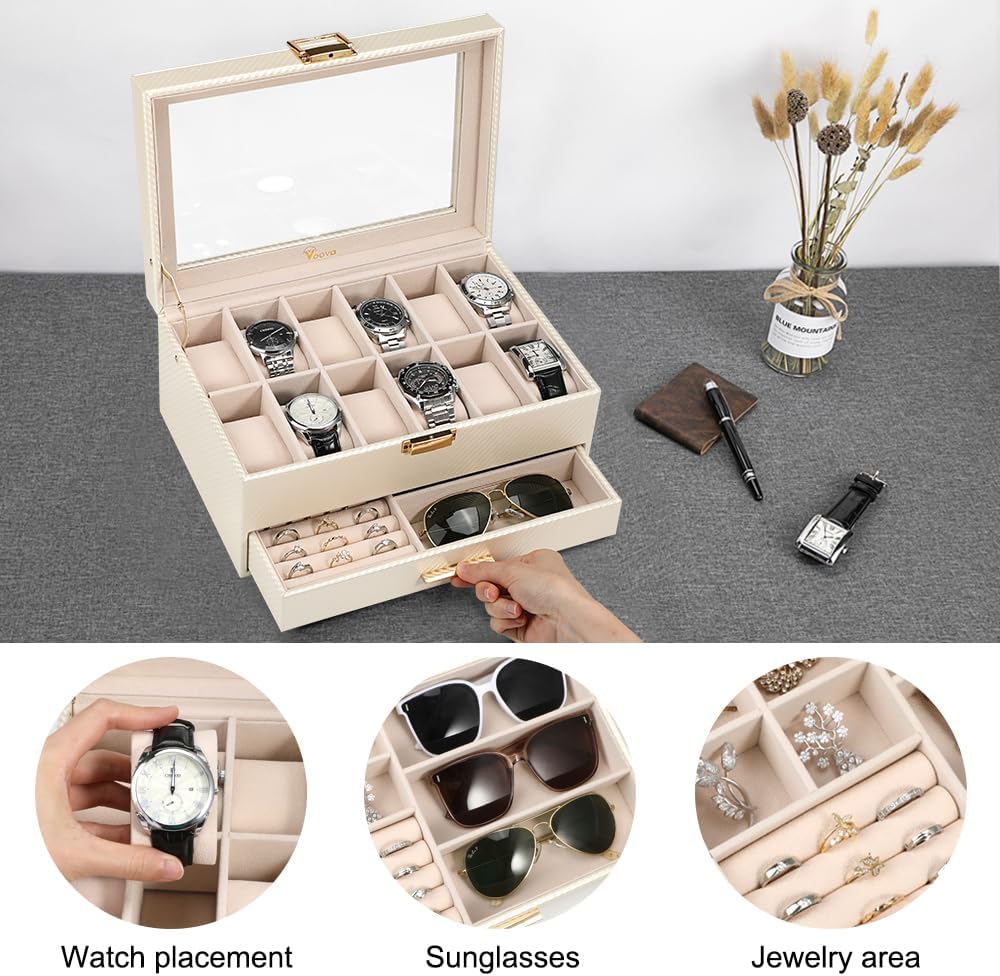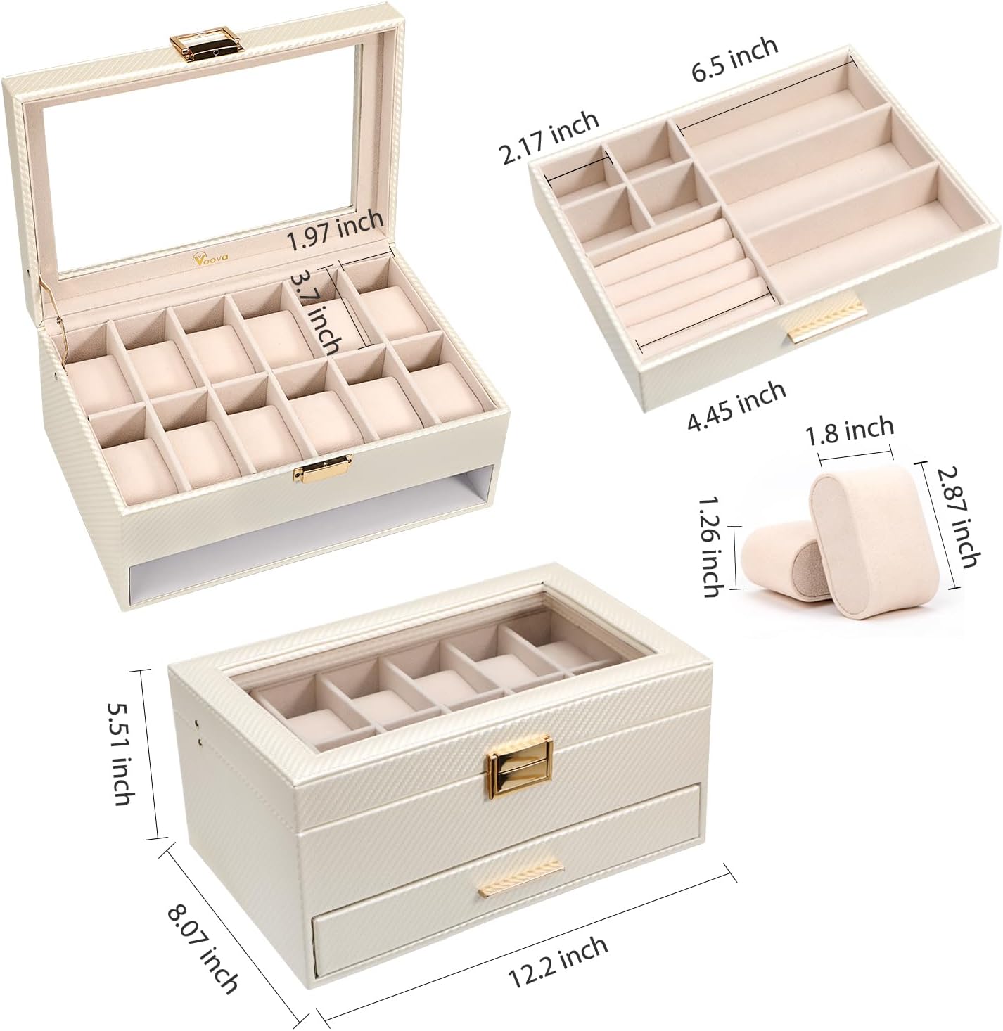 Voova Watch Jewelry Box Organizer for Men Women,12 Slot Leather Watch Storage Case Display Holder with Jewelry Drawer, Rem...