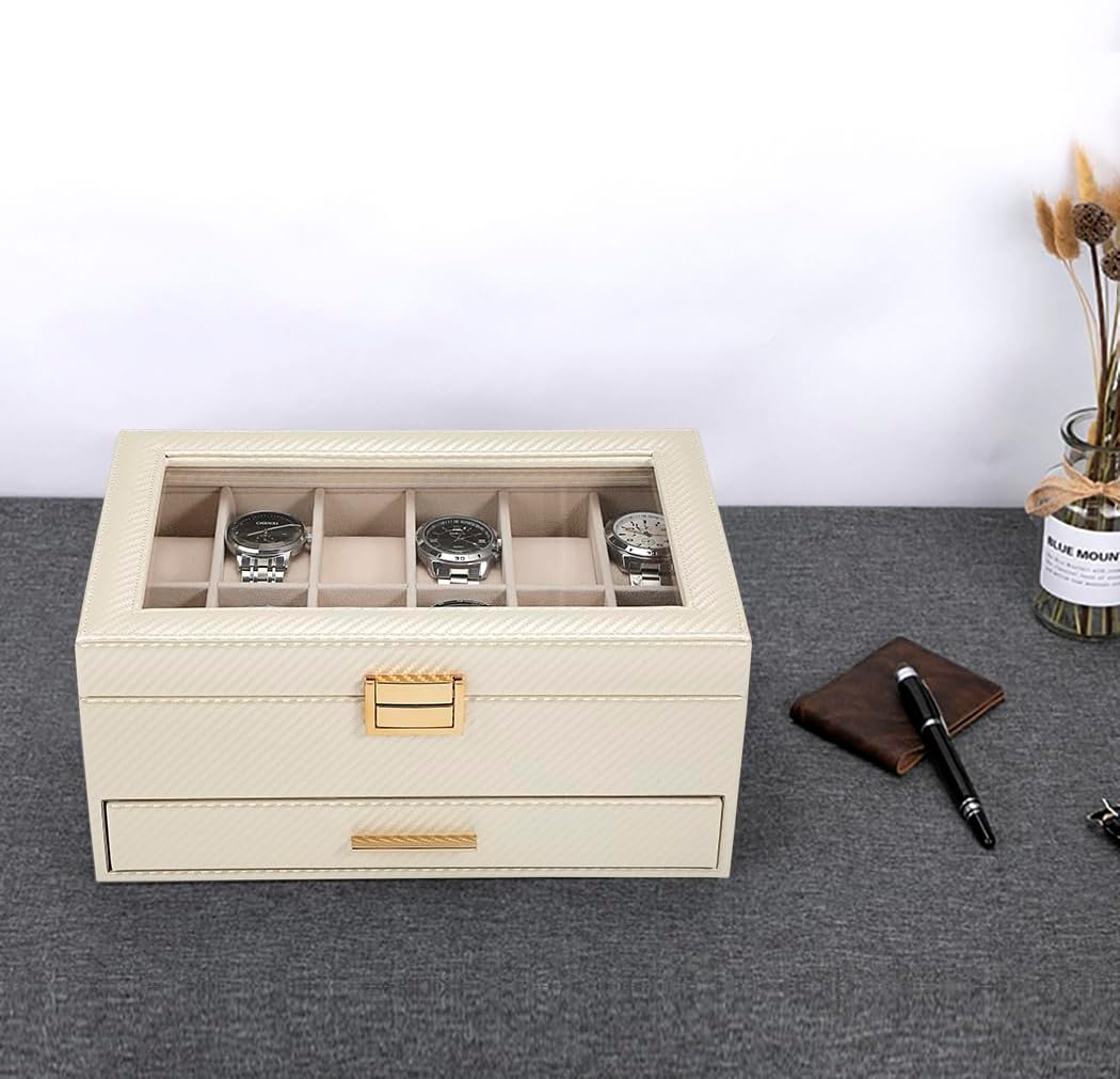 【HIGH QUALITY STORAGE】: The hollow glass cover design keeps your watch away from dust and provides a wide view. The jewelry storage organizer can be completely displayed outside when friends or relatives visit, you can easily take out anything and quickly provide storage. Every visitor will envy your watch organizer.