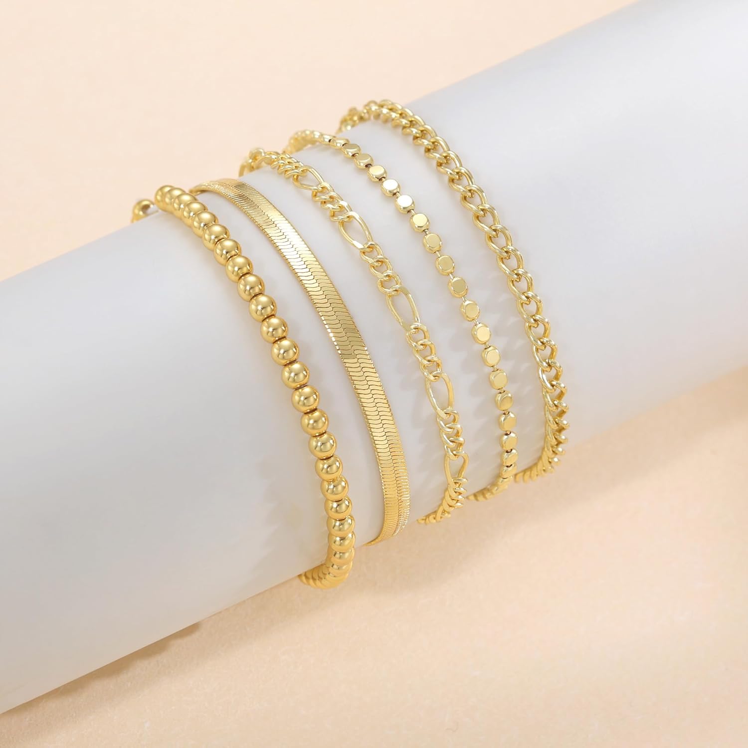 Graceful Gold Bracelets Set: Consisting of Beaded Bracelets, Figaro Bracelets, Dot Chain Bracelets, Cuban Link Bracelets, and Herringbone Bracelets. Suited for layering or single wear.