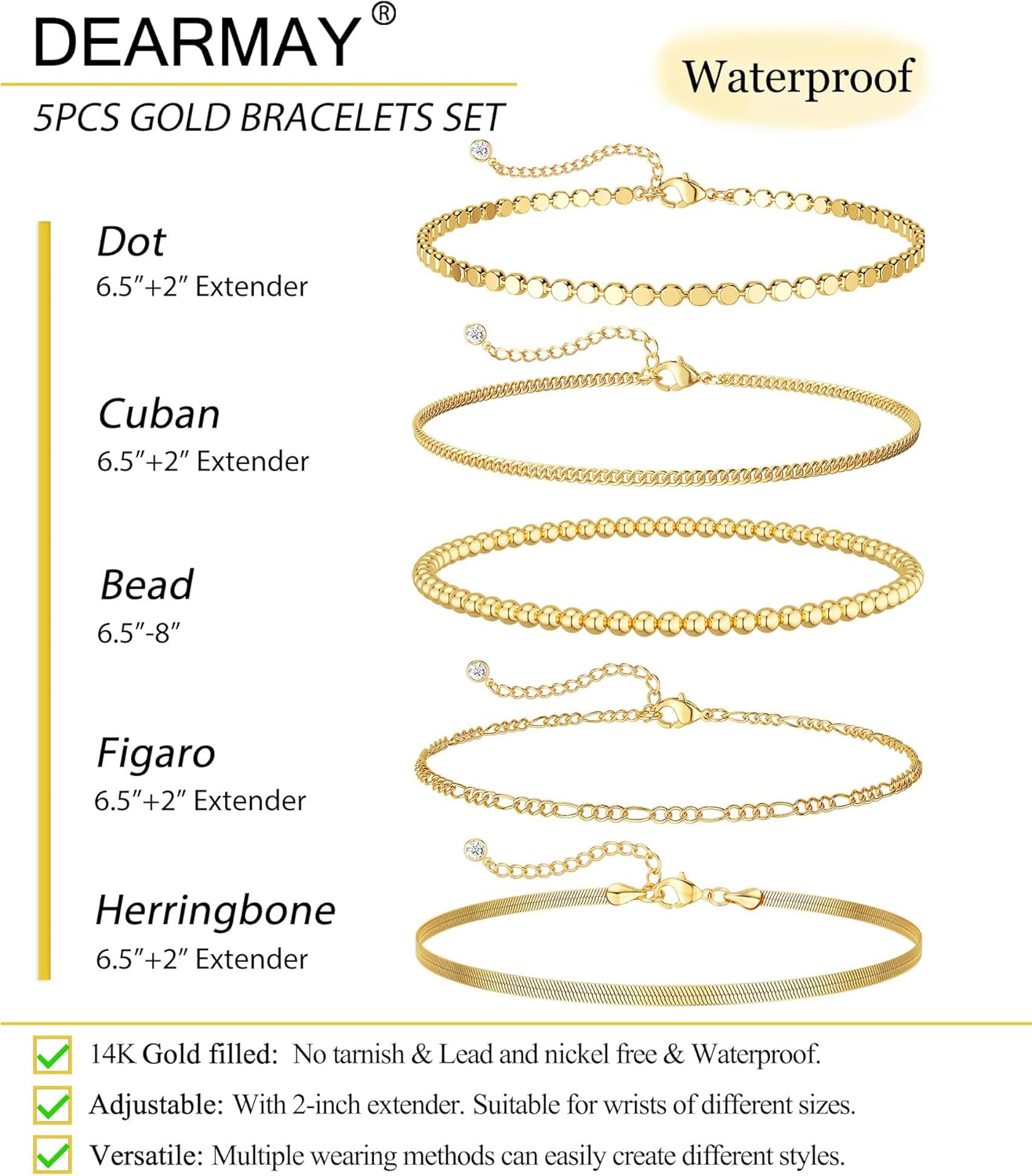 DEARMAY Gold Bracelets for Women Waterproof, 14K Real Gold Jewelry Sets Trendy Thin Dainty Stackable Cuban Link Paperclip ...