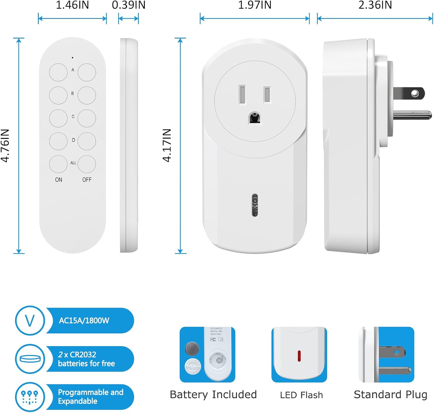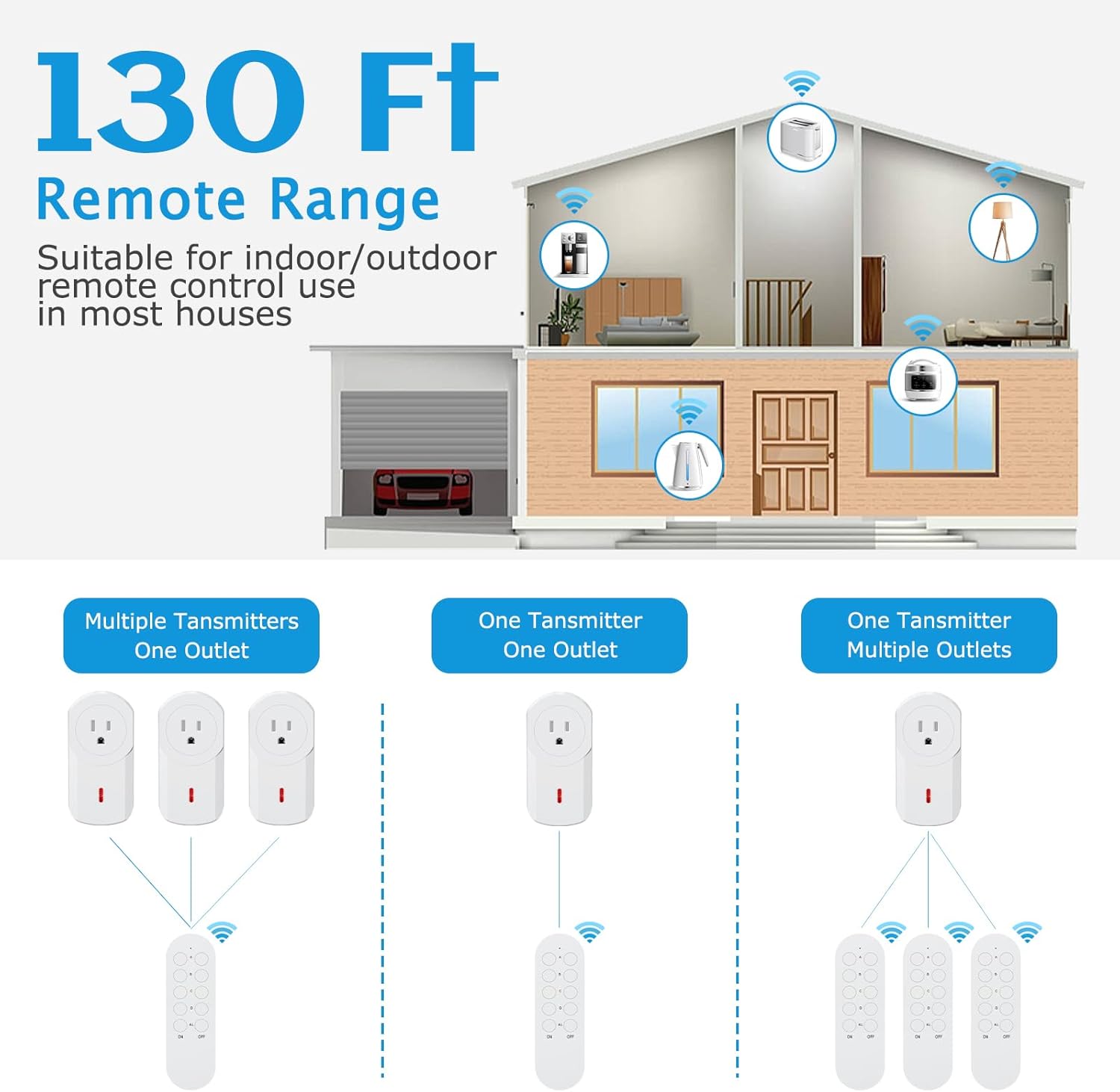 130 FT RANGE: Strong RF signal works through walls and doors up to 130 feet (40m), the remote control outlet plugs are suitable for open areas such as bedrooms, living rooms, and garages without interfering with other household appliances