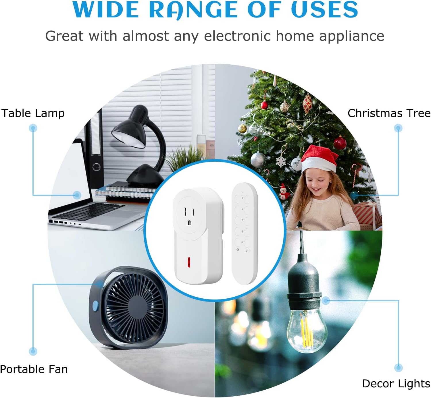 HIGH POWER: The working current of the remote control outlet is as high as 15A, suitable for most household appliances, perfect for lamp, ceiling lighting, Christmas tree, holiday decoration, fan, and other electrical devices