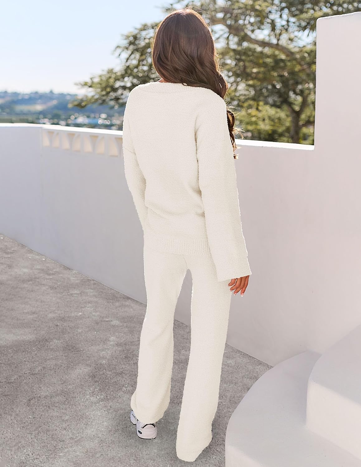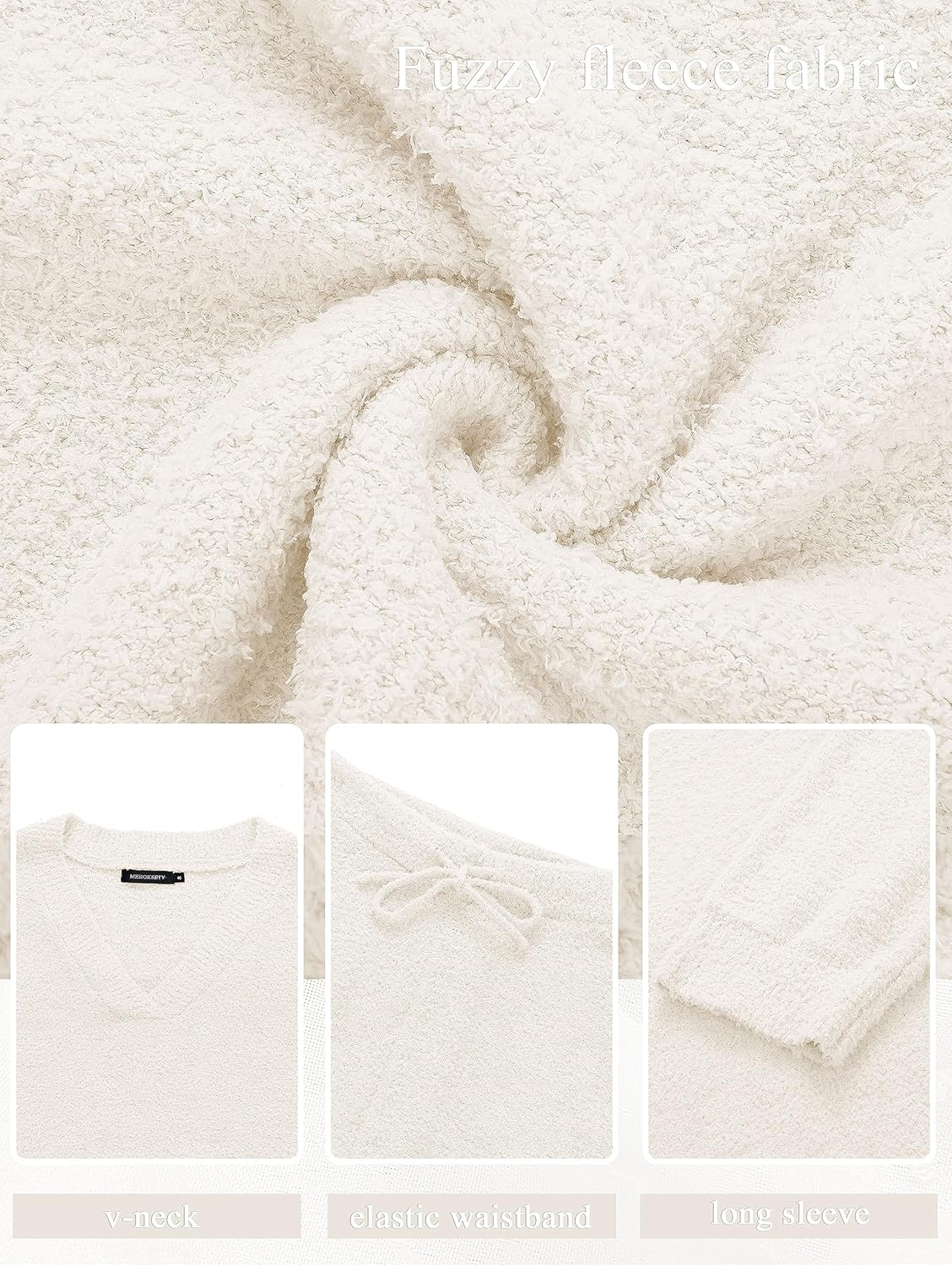 Feature: Fuzzy fleece fabric, long sleeve, v-neck, drop shoulder, high waist with adjustable drawstring, elastic waistband, soft plush set, loose sweater top, and wide-leg pants