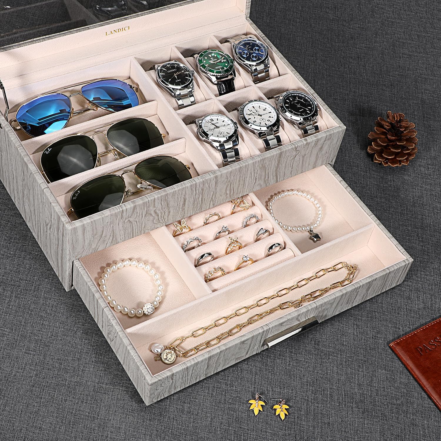 Moveable Jewel Drawer: It can use separately.2 compartmens on two sides for bracelet or bangle,1 ring or earring stud cards in the middle,and 1 long compartments for necklaces,cufflinks,brooches,pendants,neckties and other jewelry.It has enough space to storage a lot of accessories.