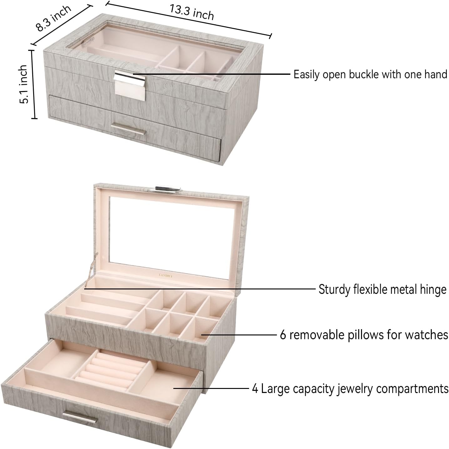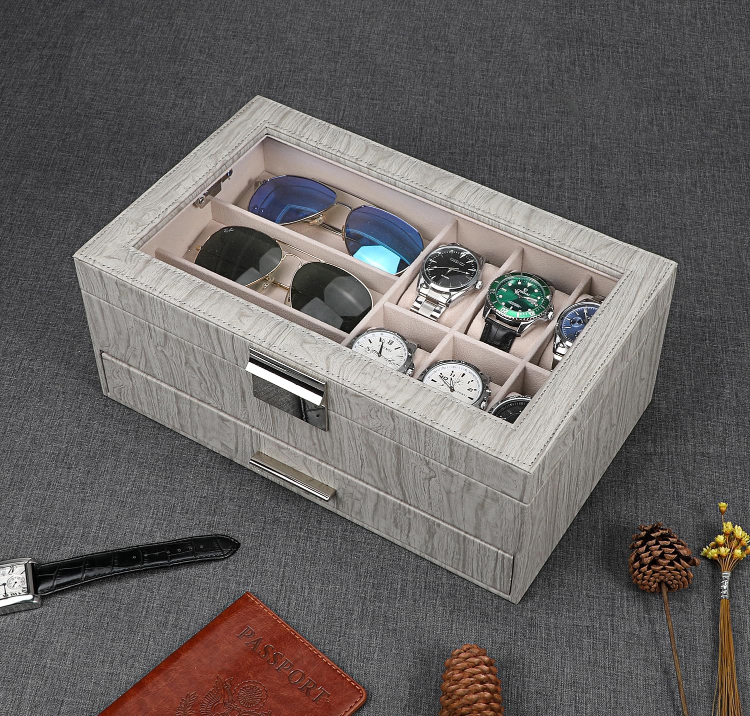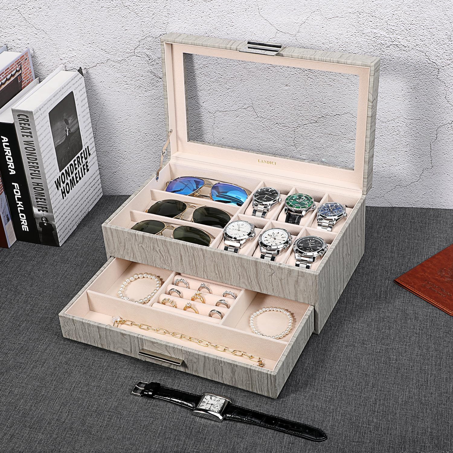 Classic Clear Acrylic Lid: Glossy acrylic lid keeps your watches from dust, and offers you an open view of the displayed watches and sumglasses.The box can be served as both a premium storage case and a great watch box showcase.It holds your most-used items and makes them easy to access plus highly organized.