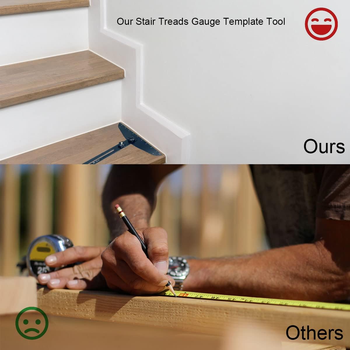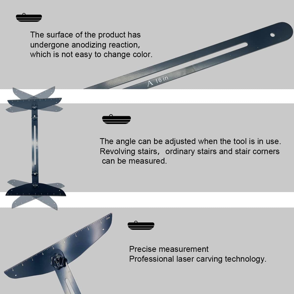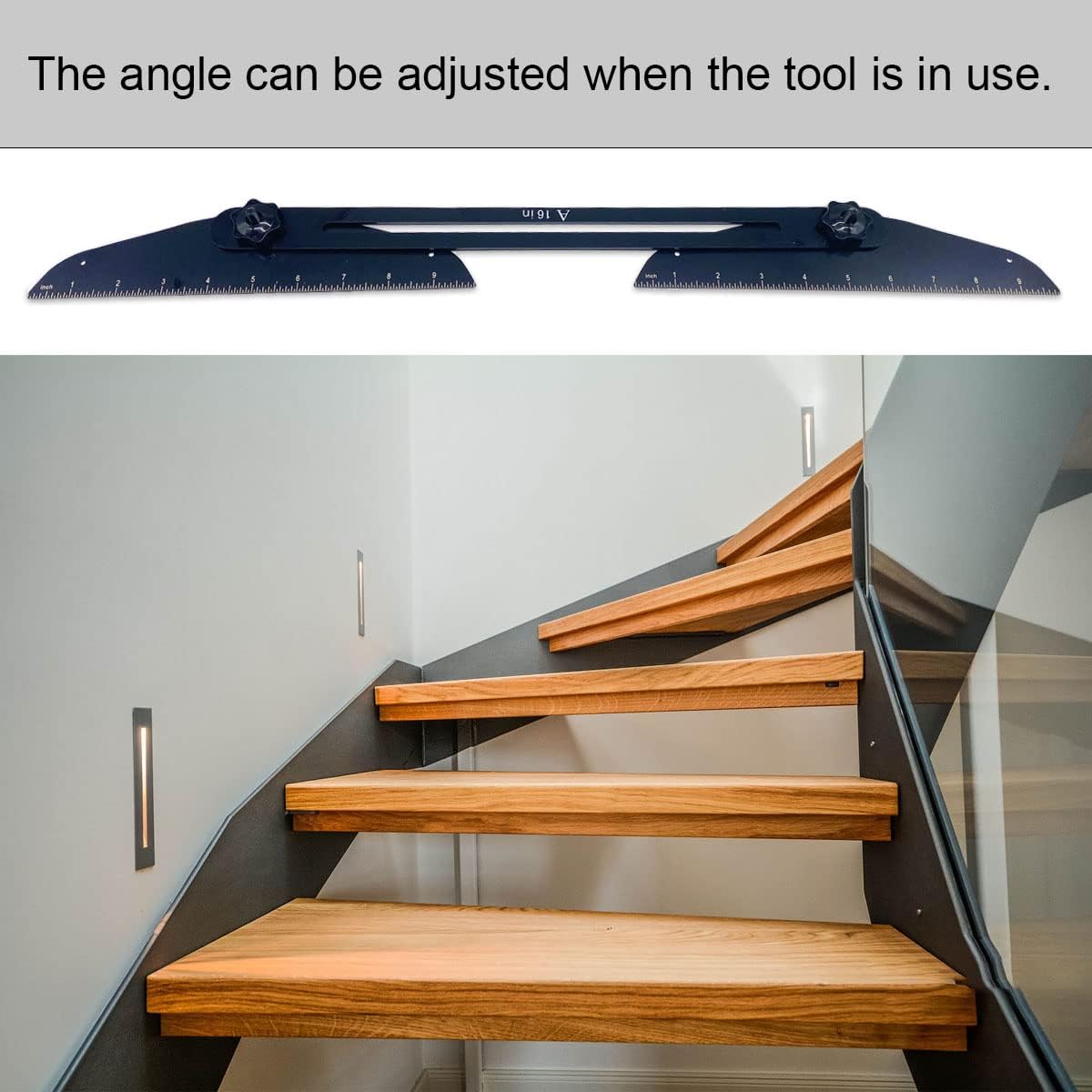 【Flexible Adjustable】: the length of the ruler is 12-60inches, and the adjustable angle is 0 ° - 300 °.Stair gauge will help you measure stair treads, risers and shelves. Easily adjust the angle, length and height to meet any work requirements, suitable for stairs, risers and shelves.