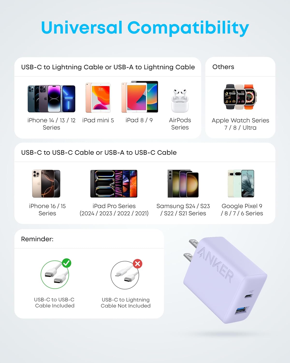 What You Get: Anker Charger (2-Port, 20W), 2-pack 5 ft USB-C to USB-C cable, welcome guide, 18-month warranty, and our friendly customer service.